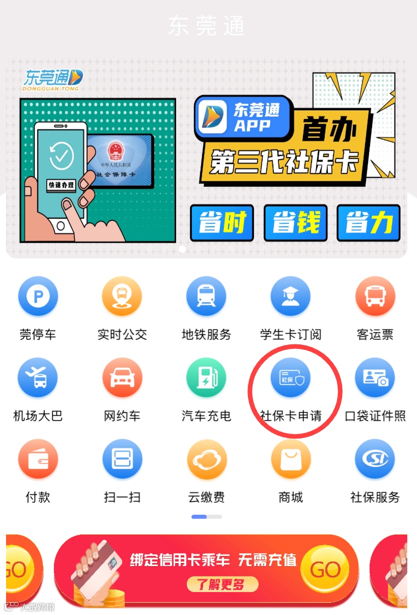 2、打开东莞通APP首页,点击【社保卡申请】,并按操作页面进行申领即可。