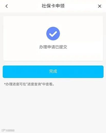 成功提交社保卡照片后,即完成线上申办操作啦!点击【进度查询】可查看社保卡申领进度。