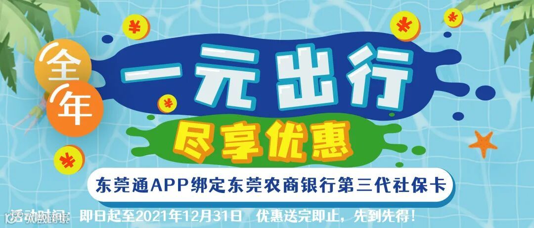 东莞通APP绑定东莞农商银行社保卡,设置为默认卡,即可享全程“一元”乘车优惠,活动时间截止至2021年12月31日,数量有限,先到先得!单用户每天享2次,优惠送完即止!