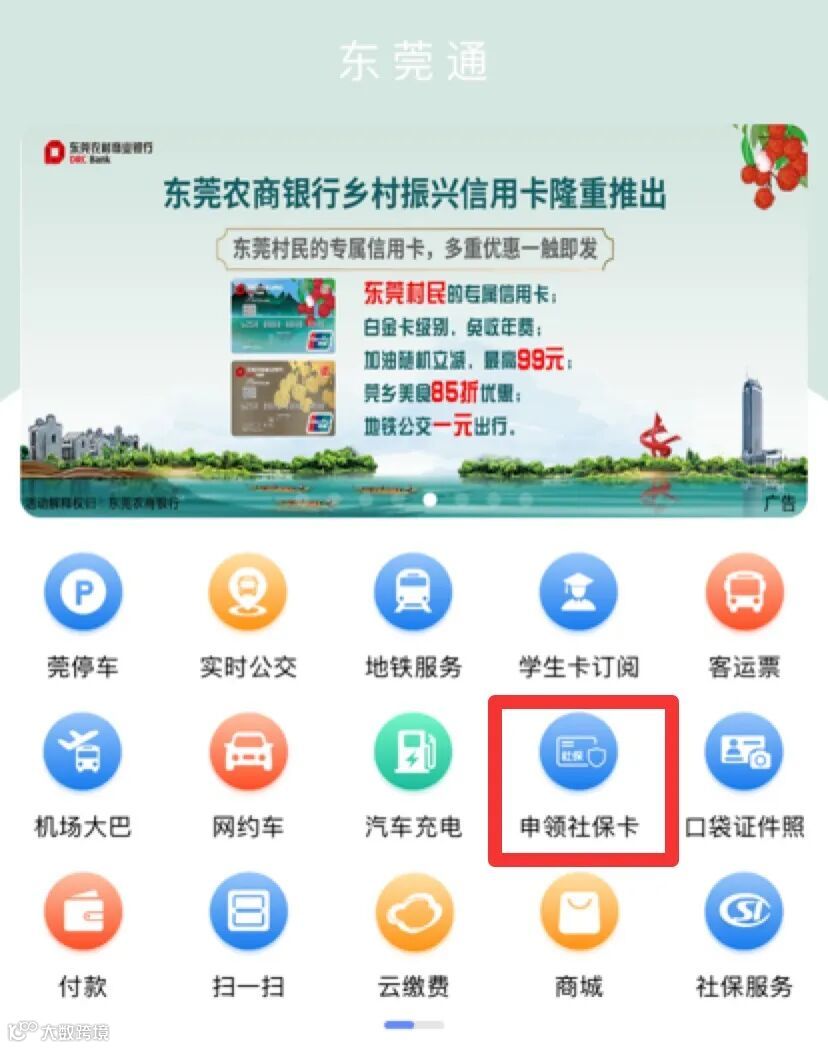 只要是东莞市社会保险参保人员且在东莞市未办过社保卡,即可通过东莞通APP申领第三代社保卡。
