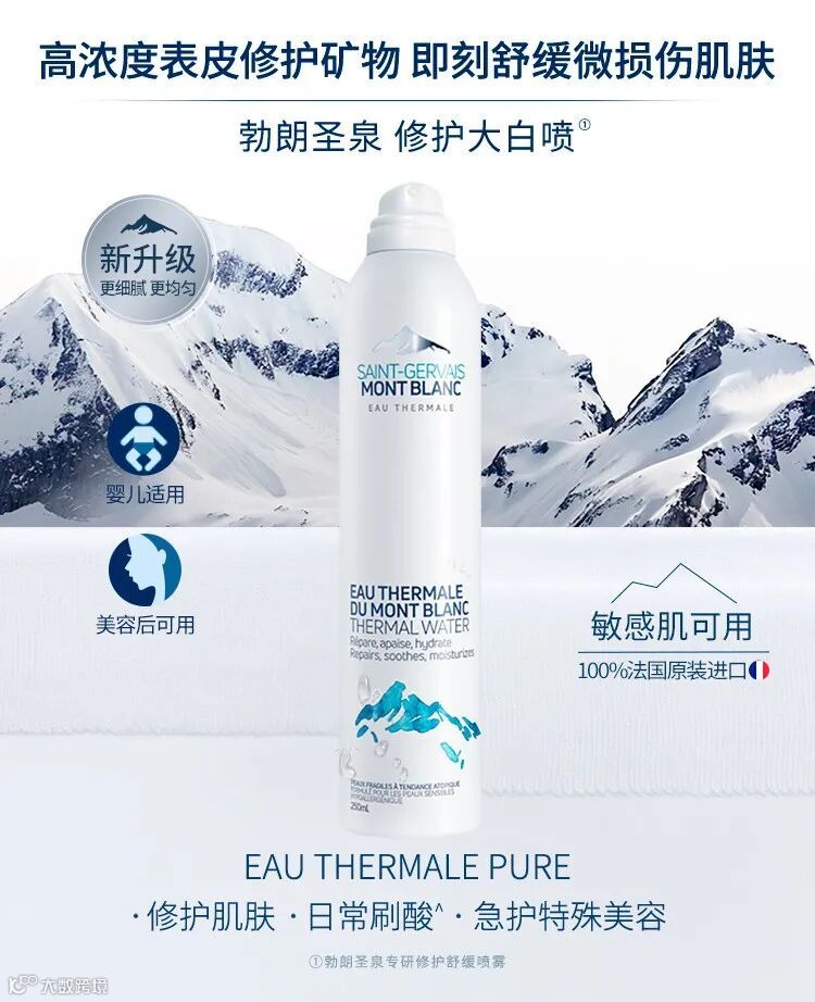 市面上做天然活泉、温泉水的品牌很多,但勃朗圣泉真的挺不一样的。由于特殊的地理气候环境,圣泉水的矿化度为普通矿物水的30倍,矿物质含量高达4500mg/L,这么高的浓度不仅仅在皮肤表面起效抵御外界环境刺激,还可以渗透进角质层,帮助皮肤舒缓修复,减少泛红和刺痛发痒,不再是普通喷雾一样无功无过的补水保湿了。