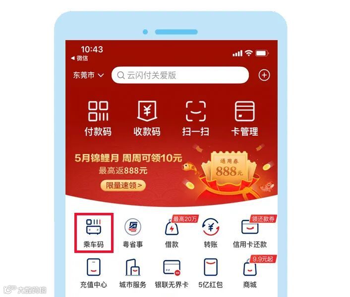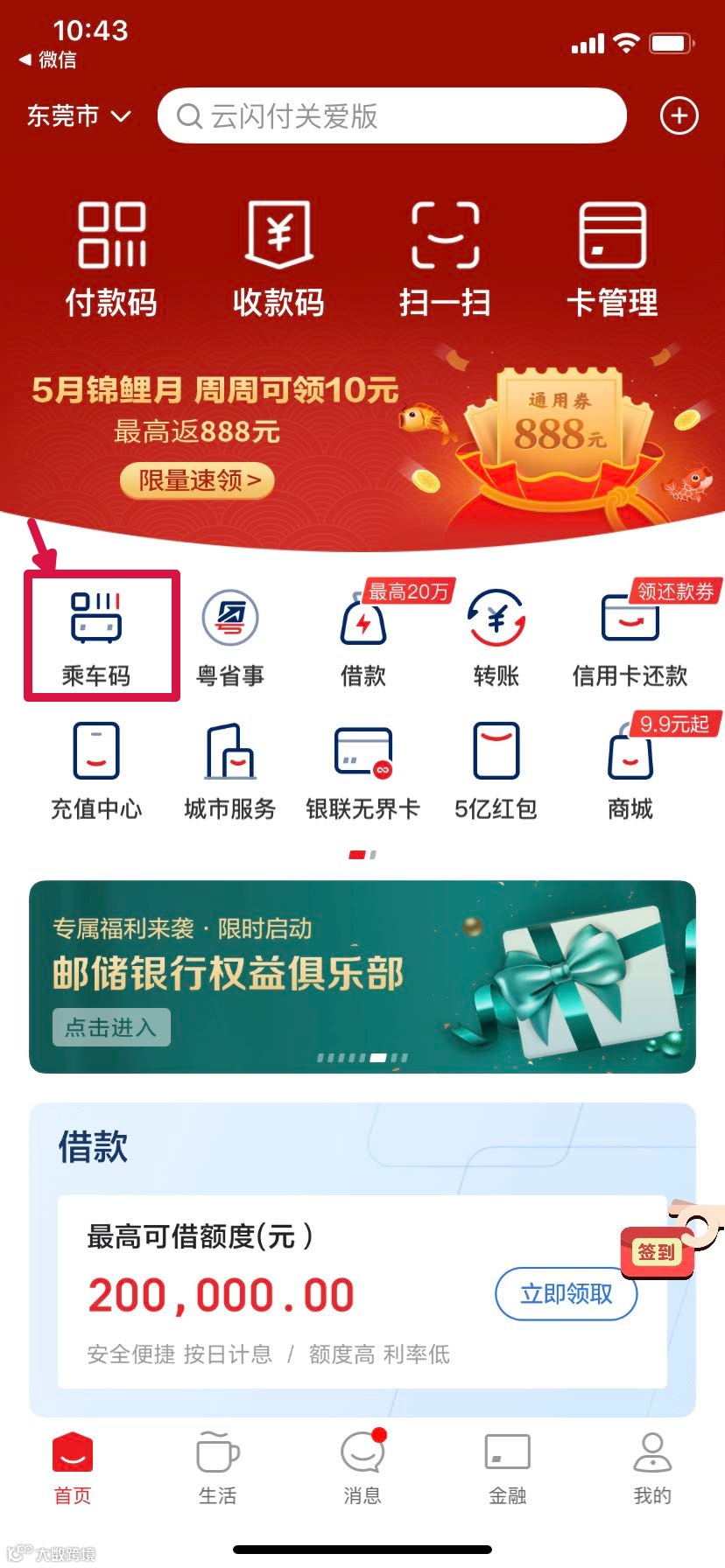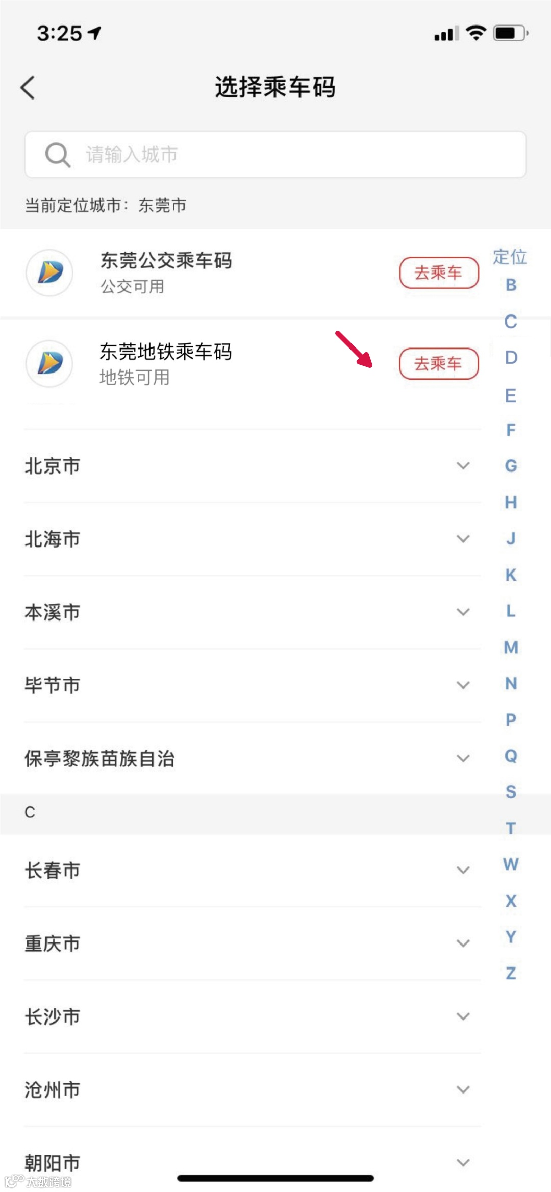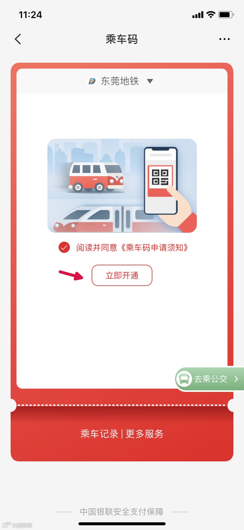 首次开通使用云闪付“东莞地铁乘车码”,用户在云闪付APP首页定位选择“东莞”,点击“乘车码”,点击“去乘车”,按照页面提示完成开通,确定授权后即可生成乘车码。