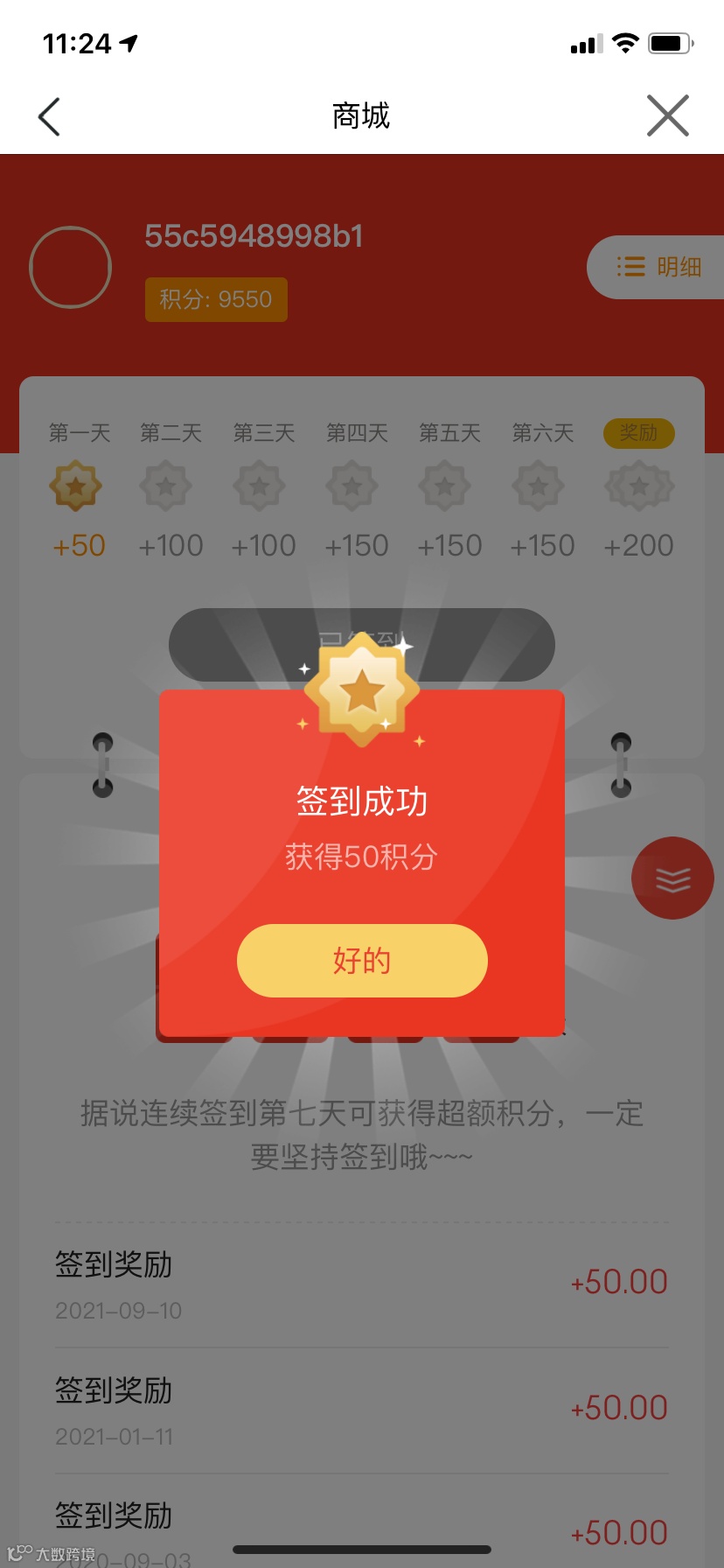 点击东莞通APP【商城】-【我的】-【积分签到】,第一天签到将获得50个积分,第二天获得100个积分,第七天将获得200个积分。