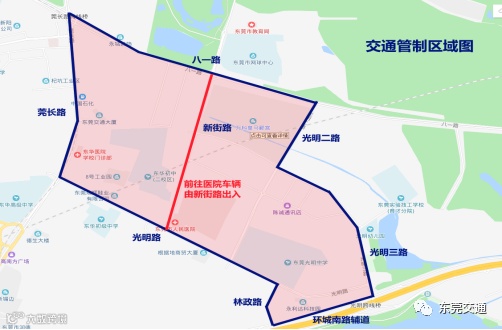 东华、光明学校交通管制区内光明路、光明一路、光明二路、光明三路、新街路、林政路、新华街、红新路、军民路、莞长路、八一路、环城南路禁止以接送学生为目的的临时停车。市民前往普济医院就医车辆全部由新街路出入。