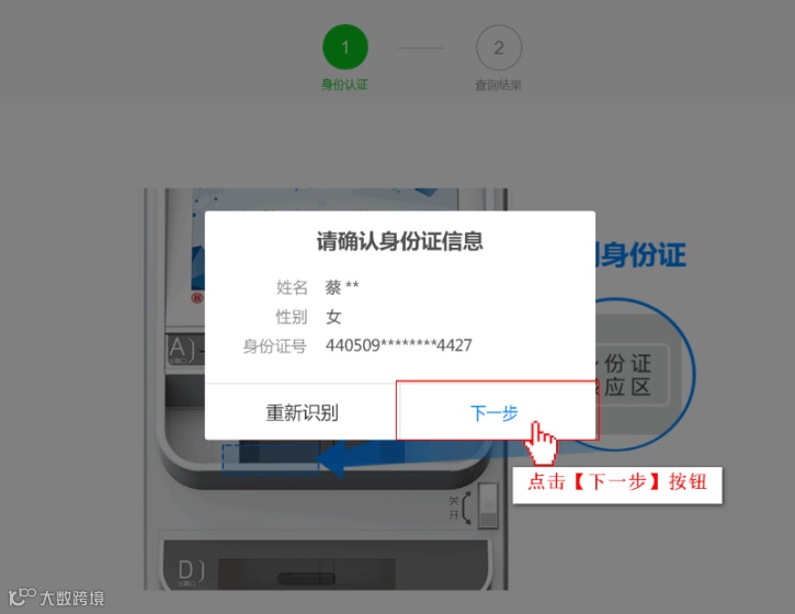 4、在【身份认证】页面确定信息无误后点击【下一步】按钮