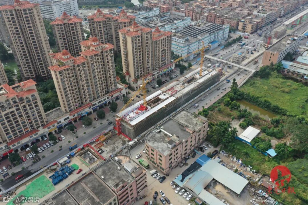 项目施工方中国中铁二局介绍,道滘站为全线第二座高架车站,位于主干道中央,沿西部干道敷设,呈东西向布置,为路中高架三层岛式车站,其中二层为站厅层、三层为站台层。车站有效站台长度为120m,站台宽12m,车站标准段外包宽度为20.8m。主体结构采用纯框架结构的建桥合一的结构型式。全线第三座高架车站道滘东站也将于年底前完成主体结构施工。