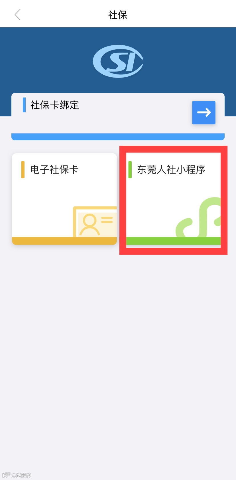 △在东莞通APP首页进入“社保”功能,点击跳转“东莞人社”小程序