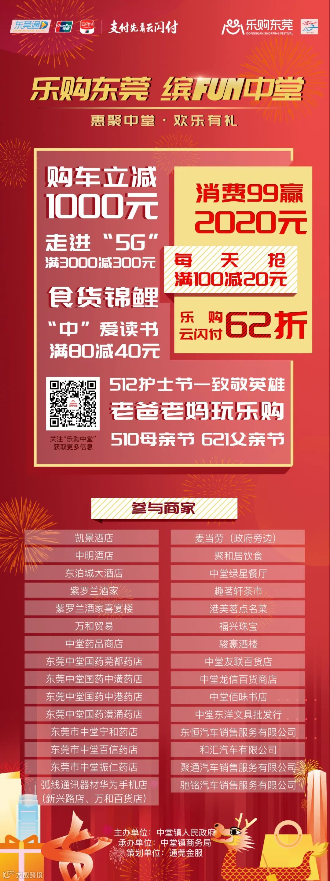 3月27日,东莞市政府发布《关于进一步拉动消费复苏 强化中小微企业个体工商户扶持的实施办法》,简称“新16条”。在市的统一部署下,为推动中堂消费市场实现稳步增长,营造全民参与的消费氛围,东莞市中堂镇2020年促消费专项行动于2020年4月27日正式开始。