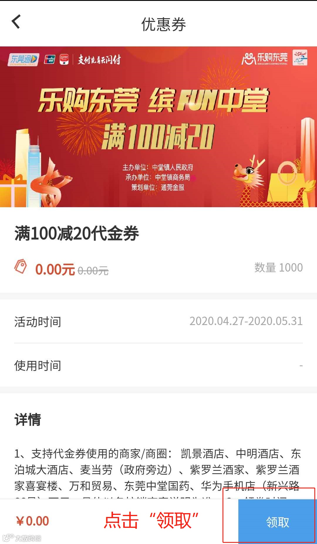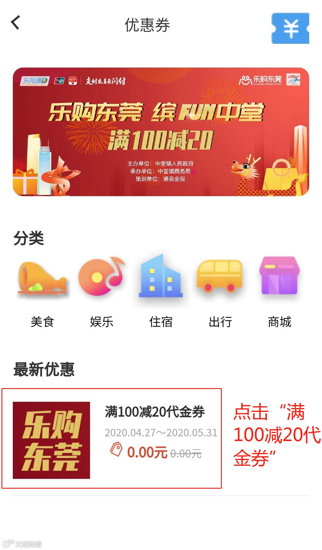 抢券方式:活动期间,市民每天可通过“东莞通APP”抢满100减20元代金券,数量5000张,先到先得。