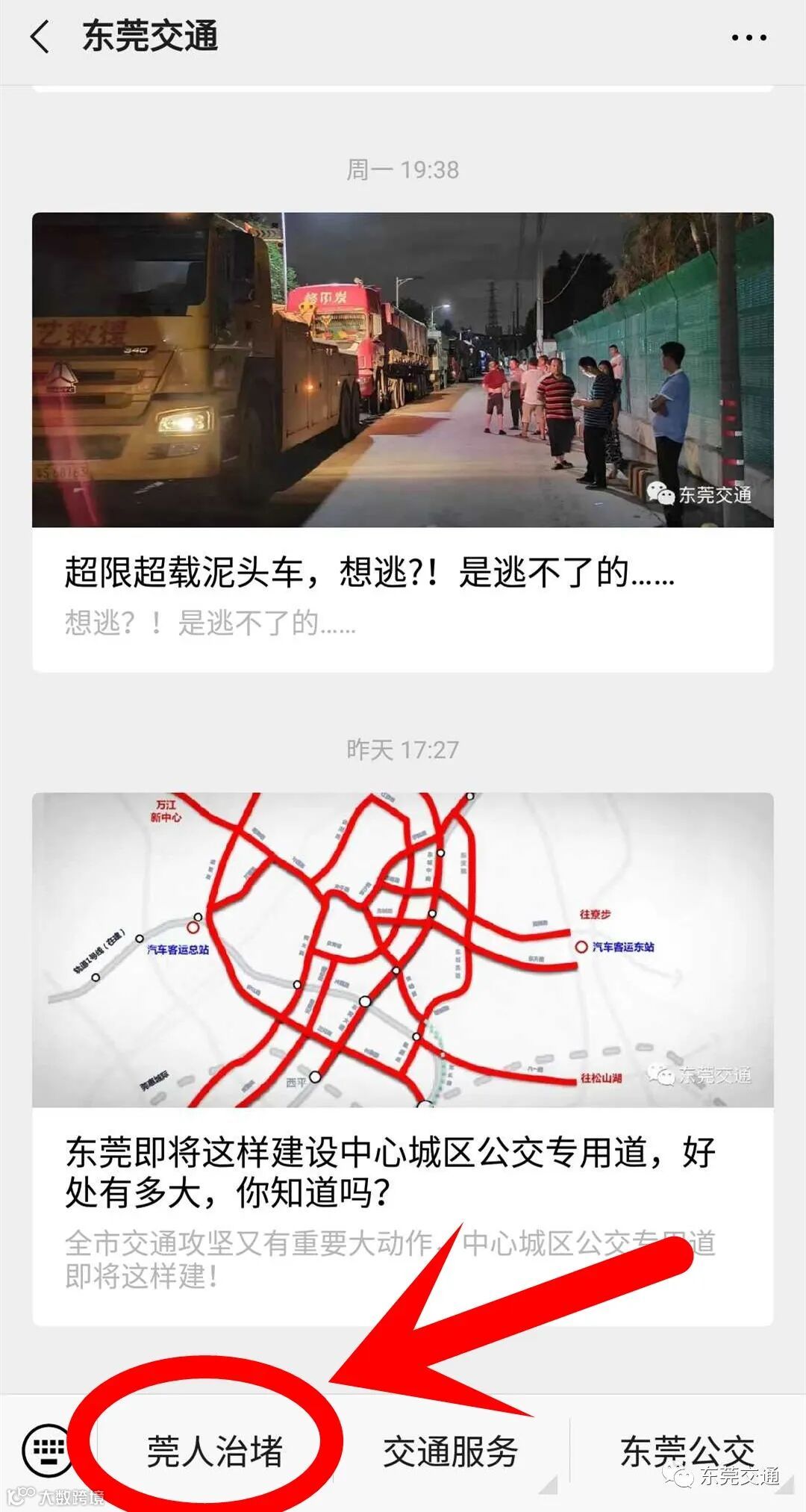 除此之外,可以进入“东莞交通”“东莞交警”微信公众号,点击菜单栏【莞人治堵】或者通过“东莞通”APP【交通资讯】向我们反映全市范围内亟需解决的交通堵点。