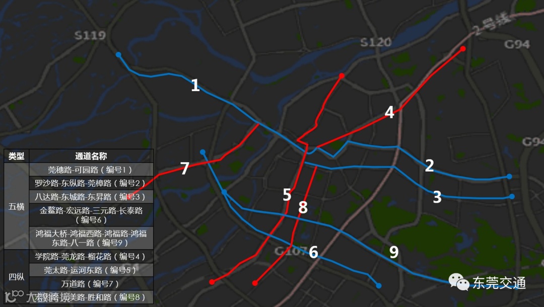 “五横”是指莞穗路-可园路、罗沙路-东纵路-莞樟路、八达路-东城路-东昇路、金鳌路-宏远路-三元路-长泰路、鸿福大桥-鸿福西路-鸿福路-鸿福东路-八一路。