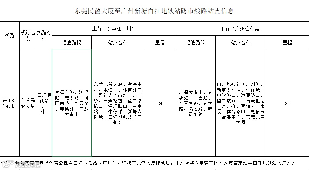 为构建东莞及广州两市城际公交体系,解决两地市民交通出行问题,为公众提供多样化的出行选择,经两市主管部门同意,东莞巴士有限公司已经在2019年1月27日开通东莞东城体育公园至广州新塘白江地铁站跨市公交线路,待民盈大厦首末站建成使用后将起点站东莞东城体育公园调整至民盈大厦。 利用跨市公交线路连接东莞轨道交通2号线与广州地铁13号线,线路全长24公里,途经鸿福路、莞太路、可园南路、可园路、莞穗路、广深大道中,设定15对途经站 |
