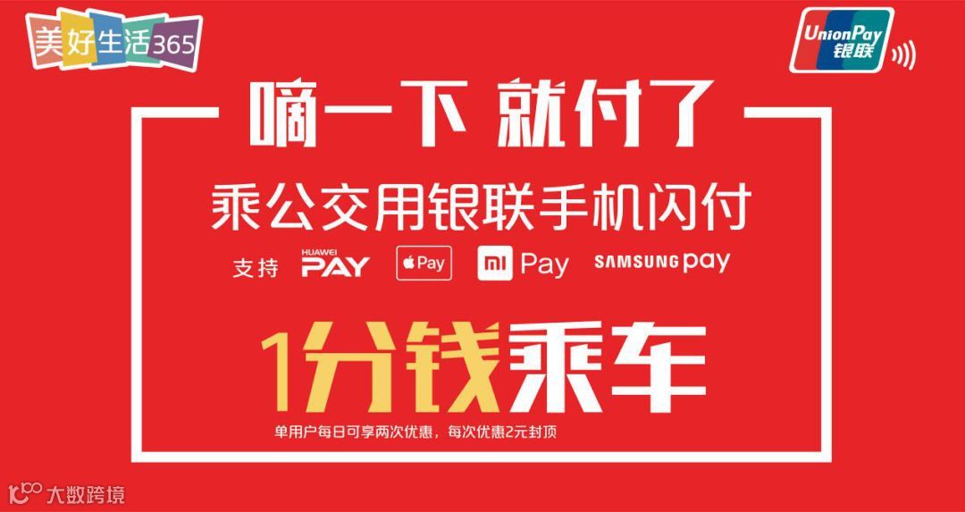 银联手机闪付搭乘公交,单用户每日可享受两次“1分钱乘车”优惠,每次优惠2元封顶