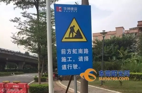 在现场,红色塑料路障将入口封闭,旁边设有温馨提示:虹南路截污次支管网工程施工,工期至2018年3月份。在此期间,虹南路实施交通管制,车辆经过水乡大道,可往豪迈路方向驶入南城村。