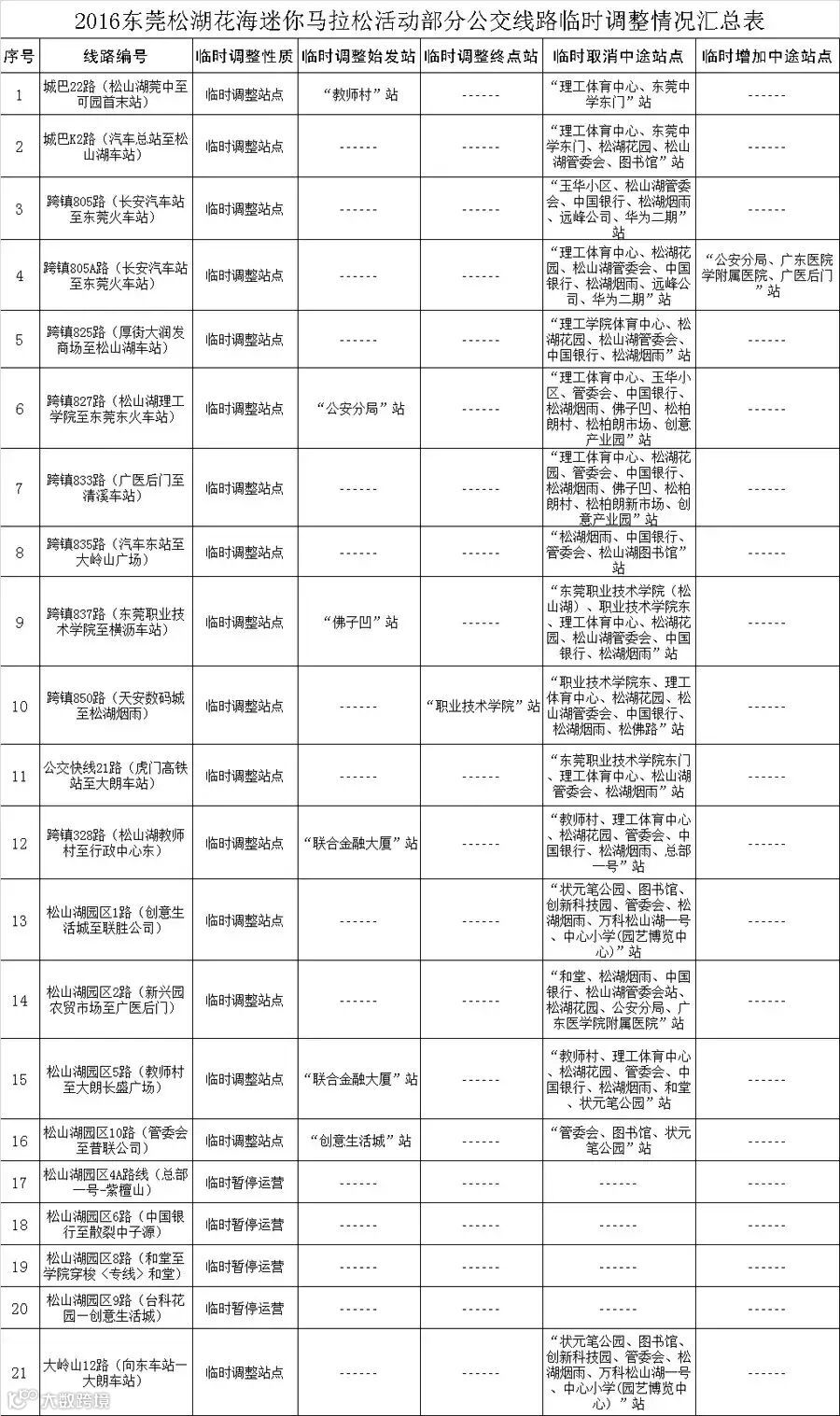 今天(3月10日)下午,东莞市道路运输管理局发布《关于“2016东莞松湖花海迷你马拉松”活动期间临时调整部分公交线路的通告》,活动期间将对途径园区内的17条公交线路临时调整停靠站点,4条公交线路暂停运营,待临时交通管制措施解除并具备公交车通行条件后,上述21条公交线路恢复正常运营。
