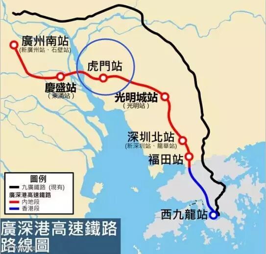广深港高铁全线起自广州南站,向东经东莞至深圳市,在龙华设深圳北站,以隧道穿越深圳市区至深圳河界接香港,终点为西九龙总站,在深圳市民中心附近设福田站。