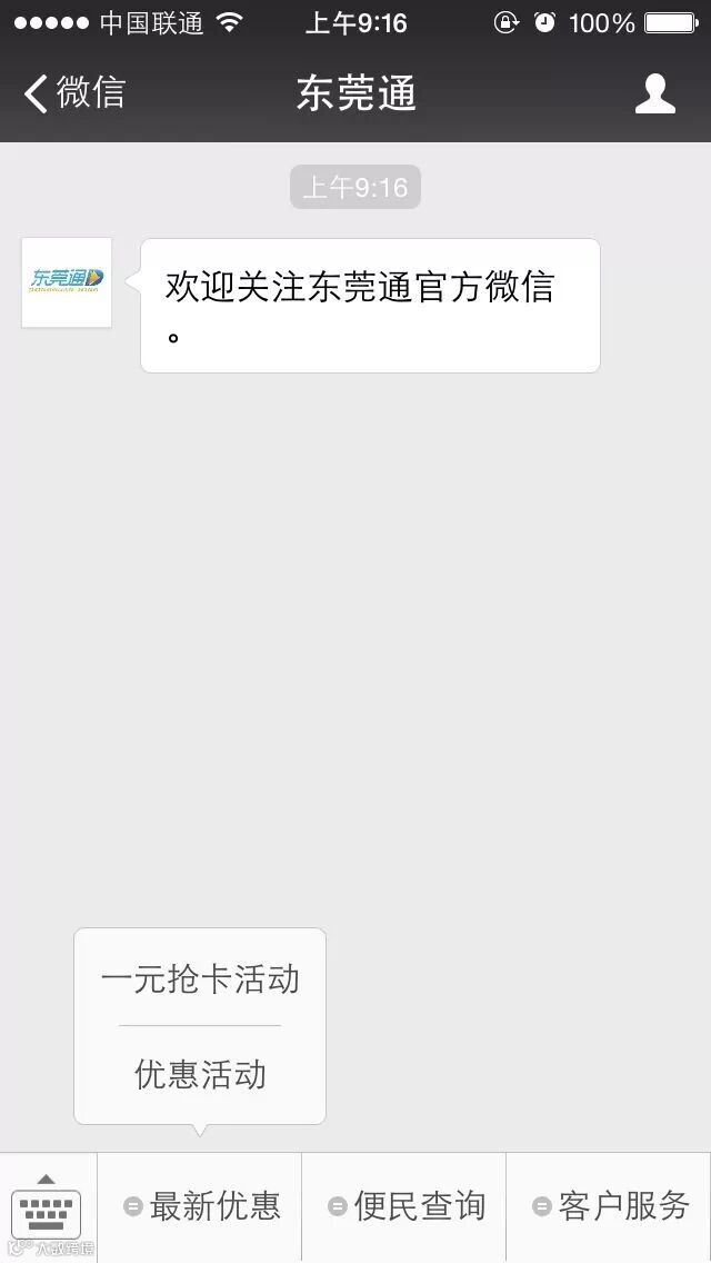 1、关注并进入东莞通微信公众号,点选“一元抢卡活动”(如下图)