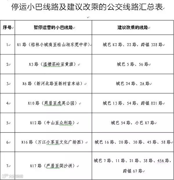 “通告”称,经研究,决定自2015年6月4日起,小巴X1路、X3路、X6路、X10路、X12路、X16路、X17路等7条公交线路暂停运营,原乘坐以上线路的市民请改乘其他走向相近的公交线路出行。同时,我局近期将加快部分城巴公交线路的调整优化,进一步完善公交线网覆盖,降低部分小巴线路暂停运营对市民公交出行的影响。