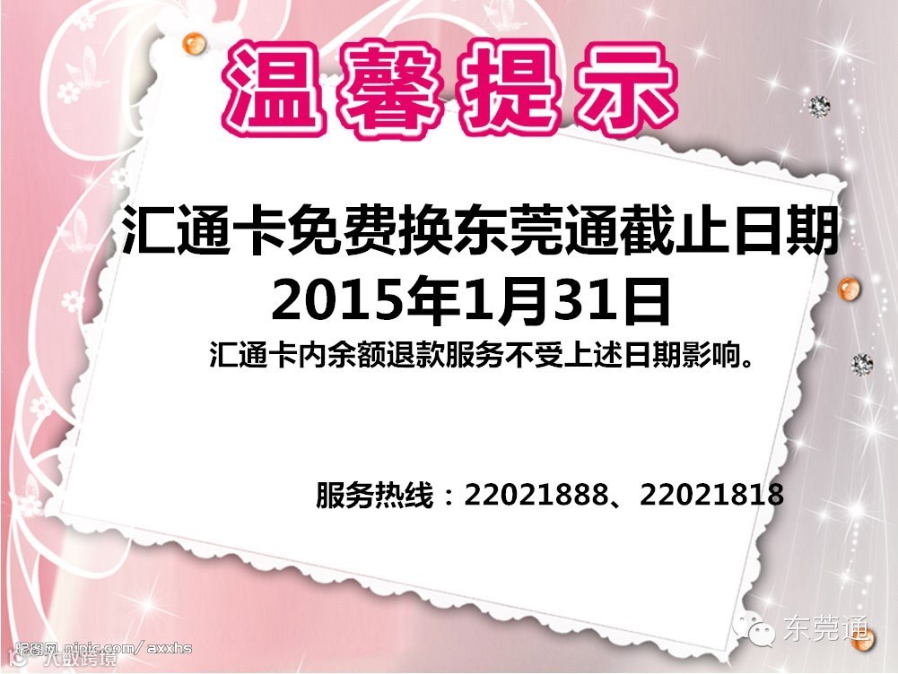 亲爱的汇通卡持卡人,您手中的汇通卡换成东莞通了吗?免费换卡期将于1月31日结束,请各位汇通卡持卡人抓紧时间到我司直营及代理网点免费更换东莞通卡吧。若错过了免费换卡期,届时换卡将收取20元工本费。不要错过最后的免费换卡机会!