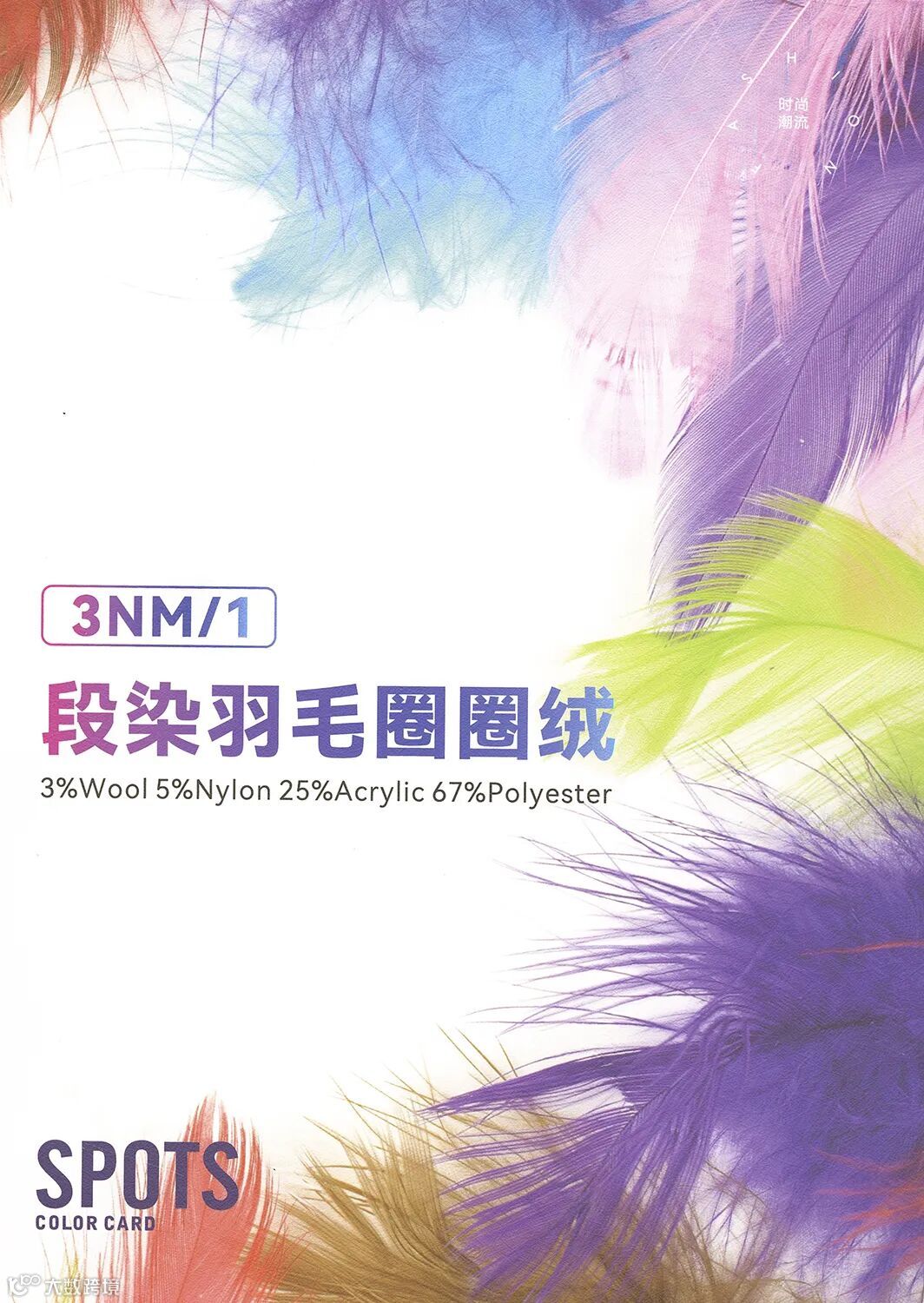 这款段染羽毛圈圈绒,规格为3NM,独特的设计融合了高品质材料。成分包括3%羊毛,带来天然柔软与保暖性;5%尼龙提升耐磨性和光泽;25%腈纶带来出色的染色性和弹性;以及占主体的67%涤纶,保证耐用性和强度。采用三针工艺制成,柔软舒适,质感丰富。