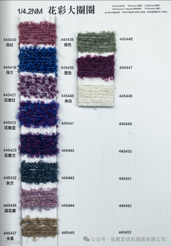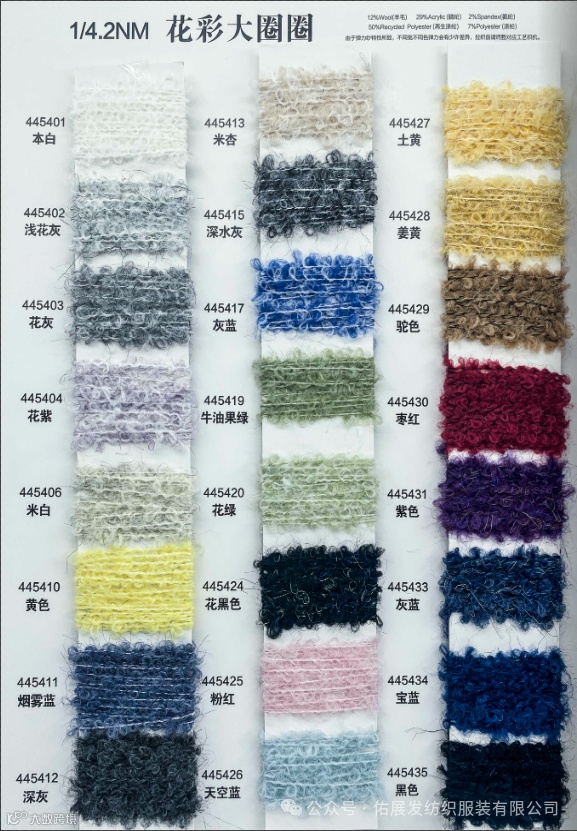 成分/比例:12%羊毛 29%腈纶 2%氨纶 50%再生涤纶 7%涤纶