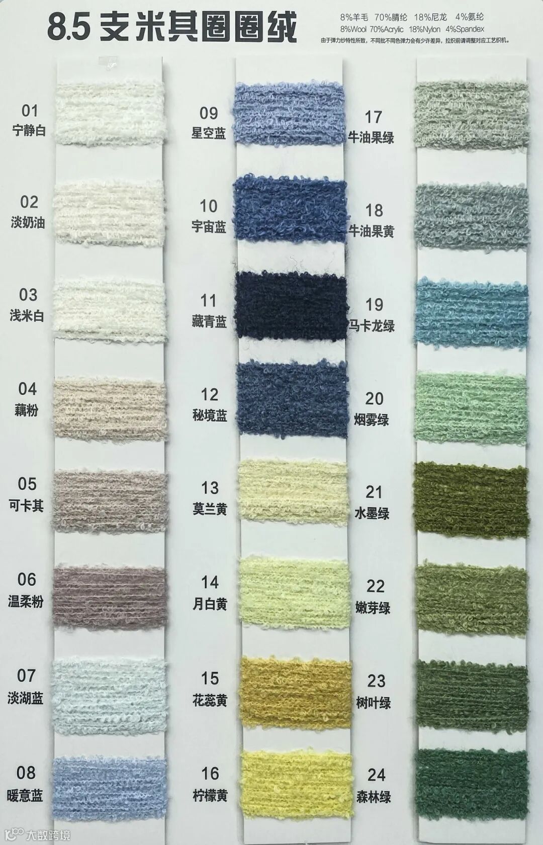 【米其圈圈绒】规格升级,采用8.5支精细羊毛。甄选高品质原料,融合了羊毛与多种优质纤维,让温暖更加升级。本产品富含天然保暖因子,内含氨纶使材质更弹,抗皱耐用,给予身体双重呵护。精密工艺打造的三五七针大钩设计,精致优雅。