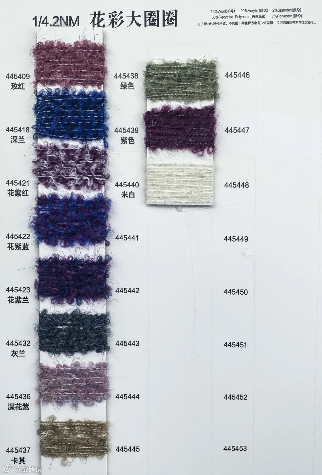 花彩大圈圈,时尚之选。规格1/4.2NM,精致细腻。成分比例独特,12%羊毛柔软舒适,29%腈纶增加弹性,2%氨纶独特质感,50%再生涤纶环保耐用,7%涤纶针形三针牢固不掉线。兼具时尚与实用,为您打造独特风格。