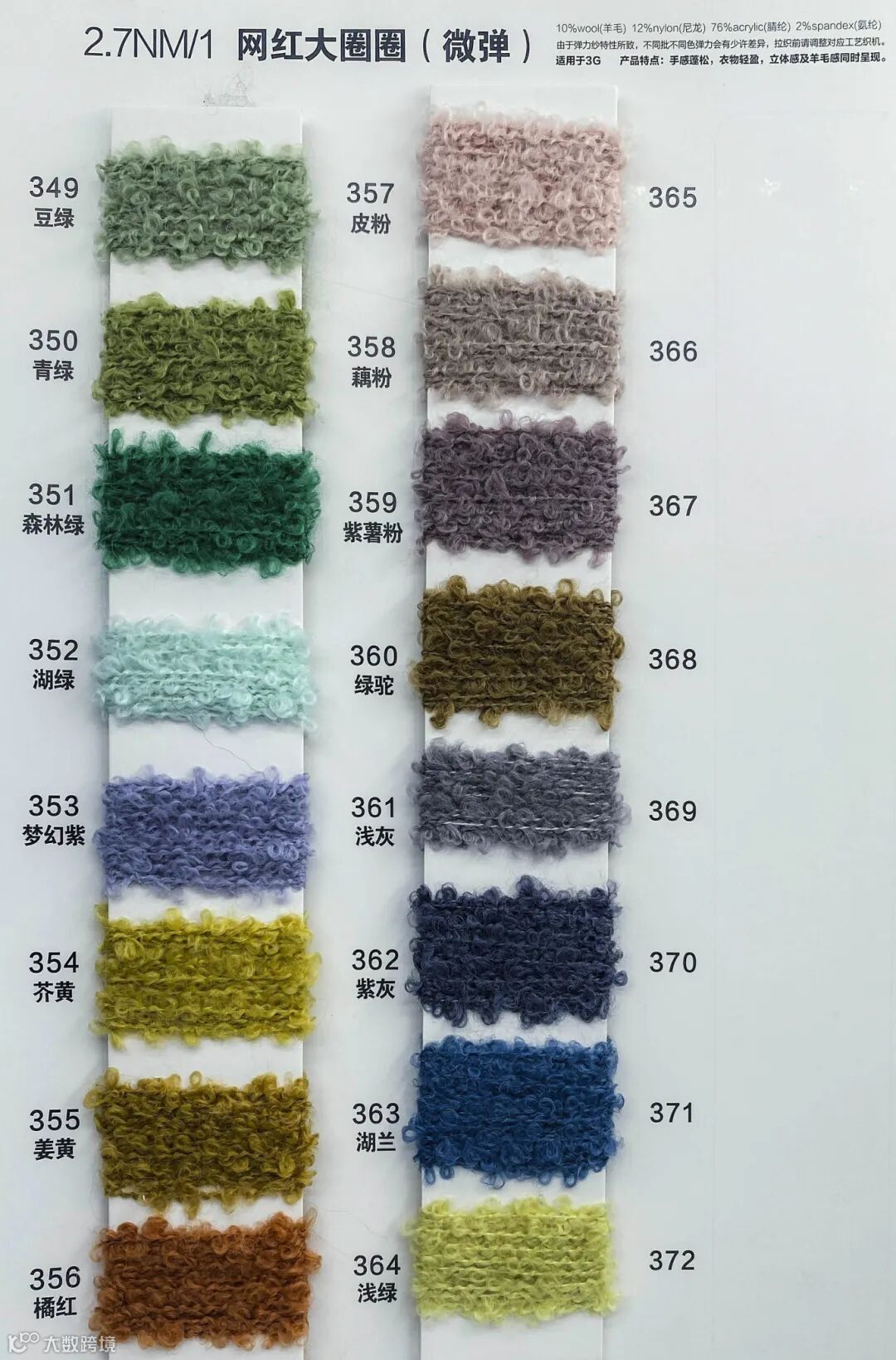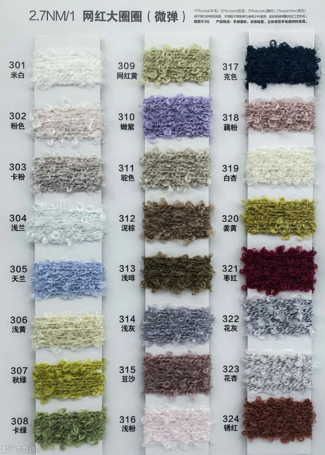 网红大圈圈,时尚之选!规格2.7NM,微弹舒适。精选优质材料,成分比例:羊毛10%,尼龙12%,腈纶76%,氨纶2%。采用针形三针工艺,精细编织,质感出众。