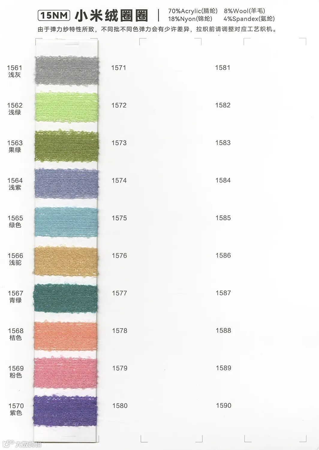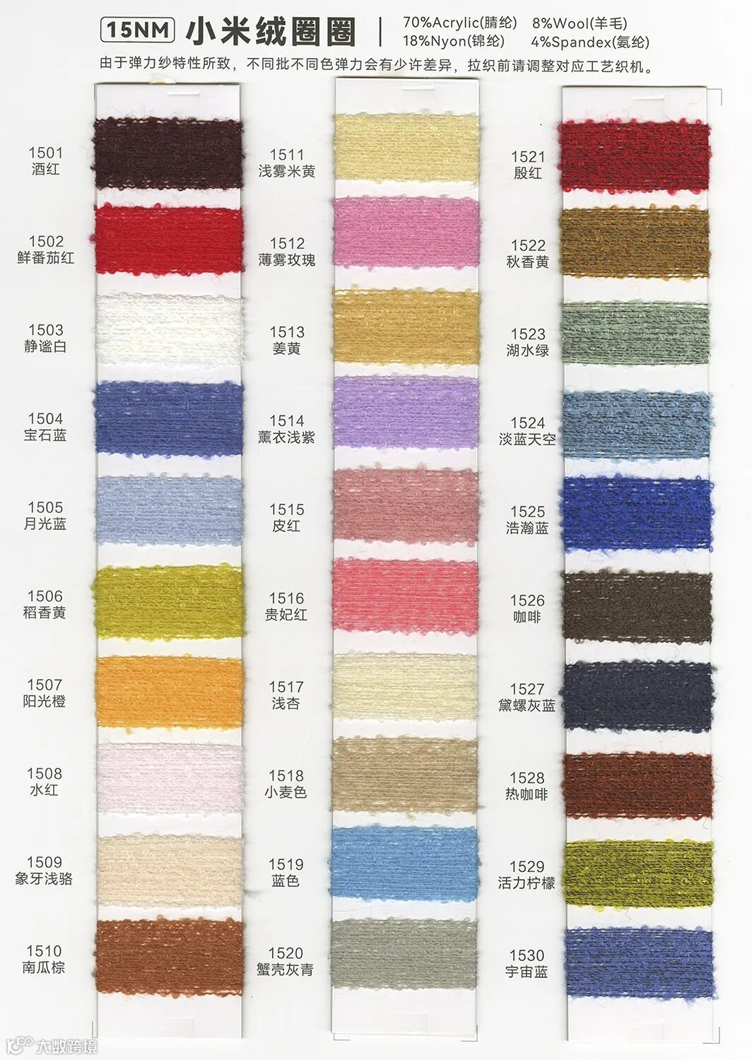 小米绒圈,精选高品质材质。规格15NM,成分搭配合理,含70%柔软腈纶,给予皮肤温馨触感;添加8%羊毛,赋予细腻与温暖;18%坚固锦纶,增强耐用性;4%氨纶完美弹性,贴身舒适。