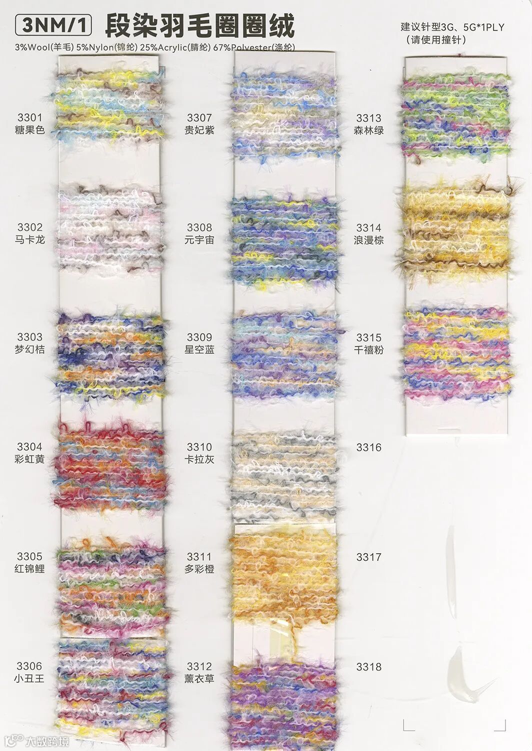 【段染羽毛圈圈绒,时尚与品质的完美融合】规格3NM/1,采用优质羊毛、尼龙、腈纶和涤纶材质,比例精心调配至最佳状态。独特的针形设计,触感柔软舒适,带来无与伦比的温暖体验。