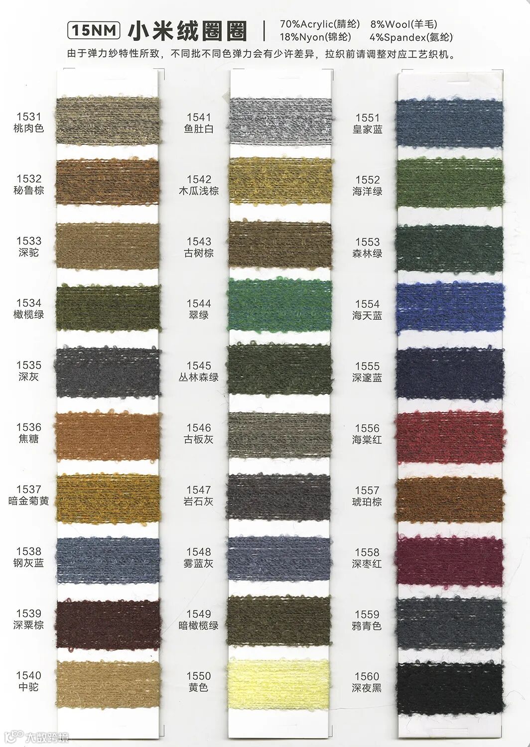 小米绒圈圈,精选高品质材质。规格15NM,以70%腈纶为主,混合8%羊毛,柔软舒适;18%锦纶,增加耐用性;4%氨纶,提升弹性。针形精细,12G工艺,呈现优质品质。带来柔软舒适的触感和长久耐用的使用体验。