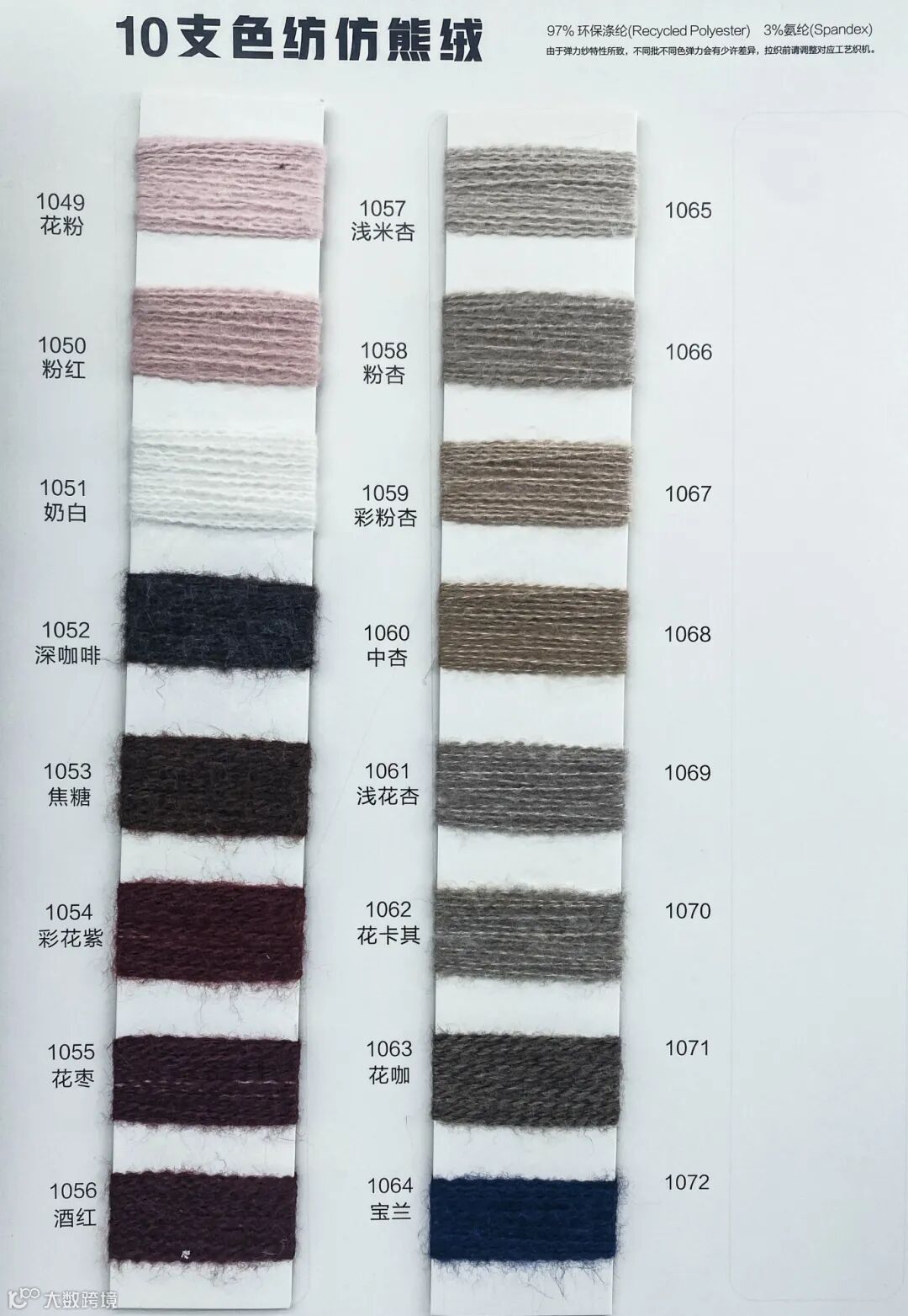 这款色纺仿熊绒,采用优质环保涤纶纤维为主材质,混合少量氨纶,带来出色的弹性和耐久性。规格为10支,针形三五七针精细编织,柔软舒适,保暖性强。成分比例科学搭配,97%环保涤纶保证绿色环保理念的同时,也赋予面料卓越的质地和稳定性。