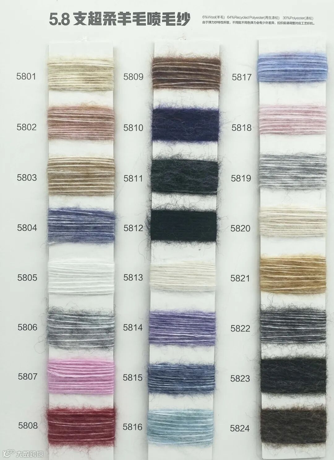 这款超柔羊毛喷毛纱,规格为5.8支,采用高品质羊毛与再生涤纶混合制成。其中含有6%的羊毛,带来天然的柔软与温暖;64%的再生涤纶则增强了纱线的耐用性和稳定性。此外,30%的涤纶成分使得纱线更加坚韧。针形三五针的设计,赋予面料更丰富的层次感与纹理感。