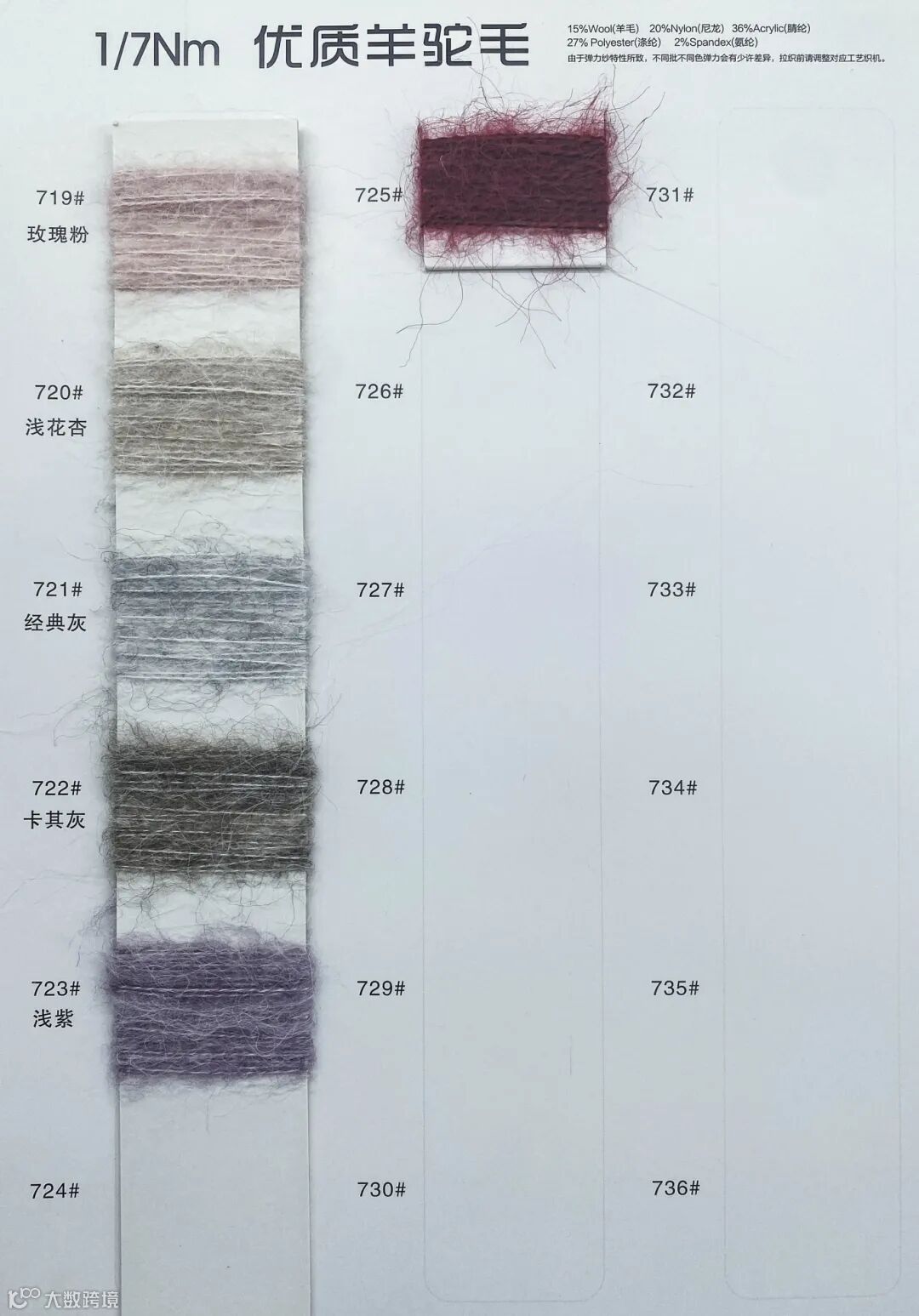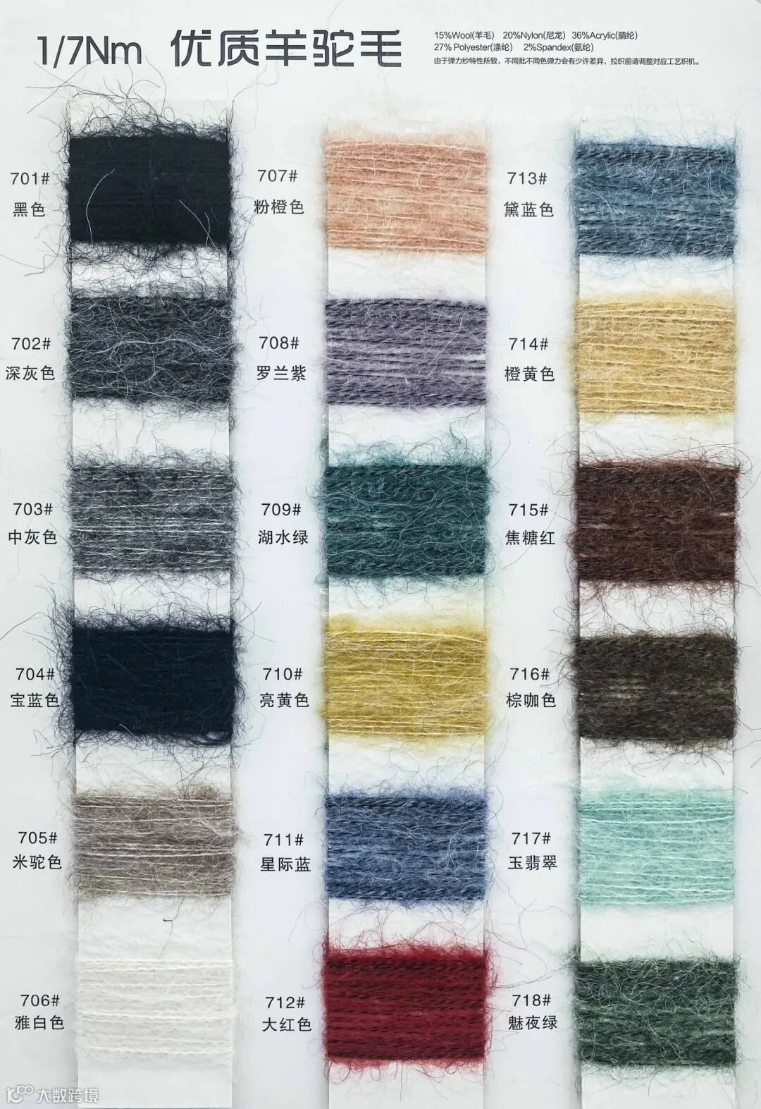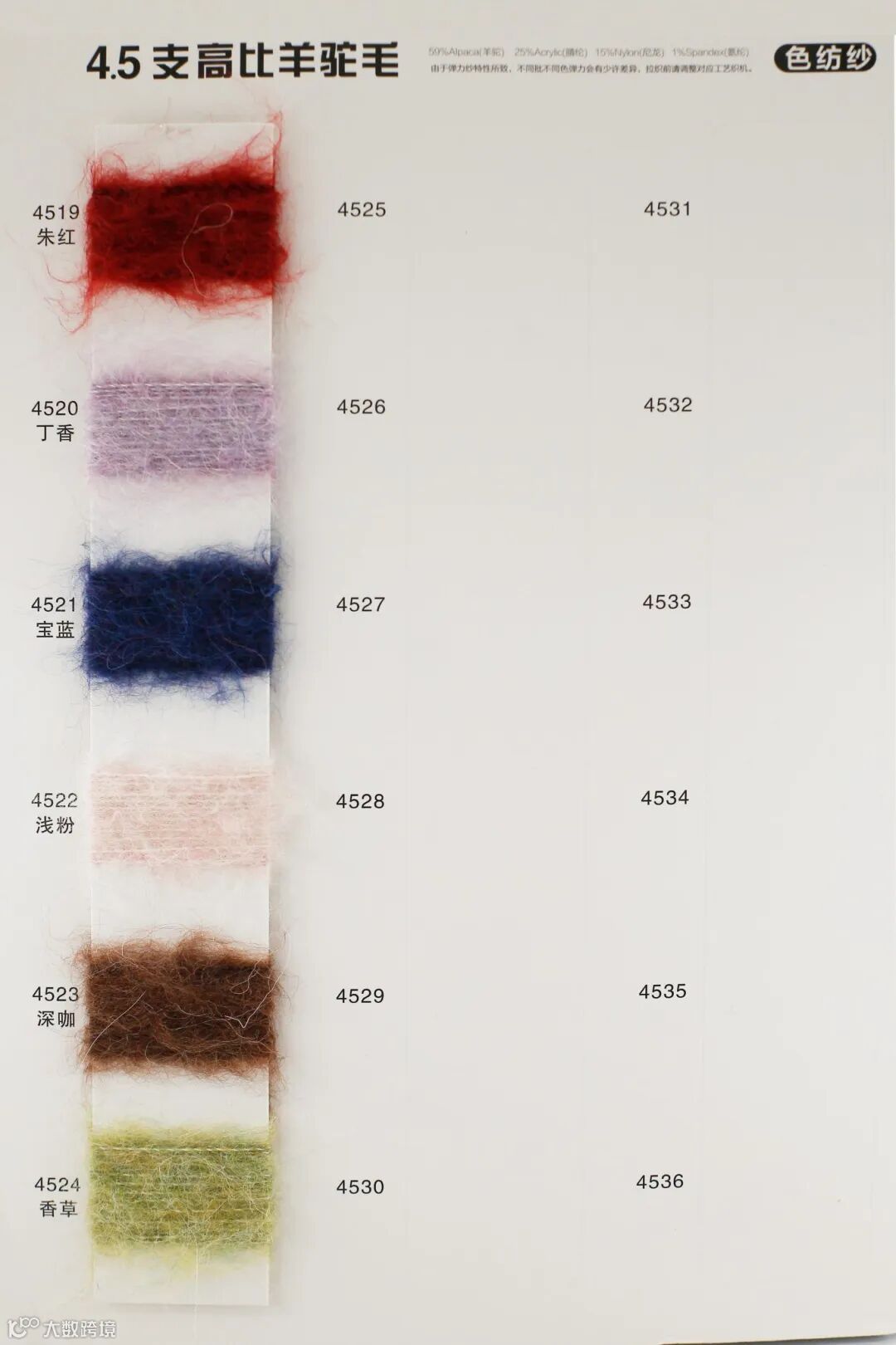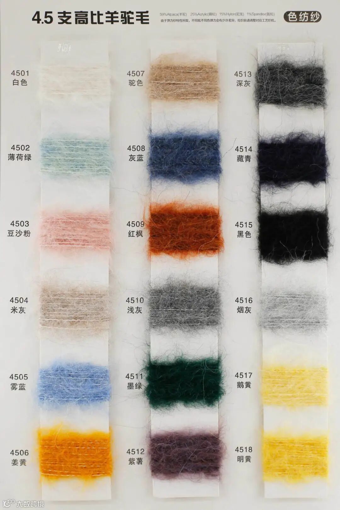 此款高比羊驼毛纱线,选用顶级羊驼毛为原料,混合腈纶、尼龙与氨纶等优质纤维,规格达到精致的1/4.5NM。其成分比例独特,融合了羊驼毛的柔软与纤维的强度与弹性。12G针形设计,带来细腻的质感与优良的保暖性能。此纱线优雅且耐用,为服装制作增添无与伦比的质感与舒适度。