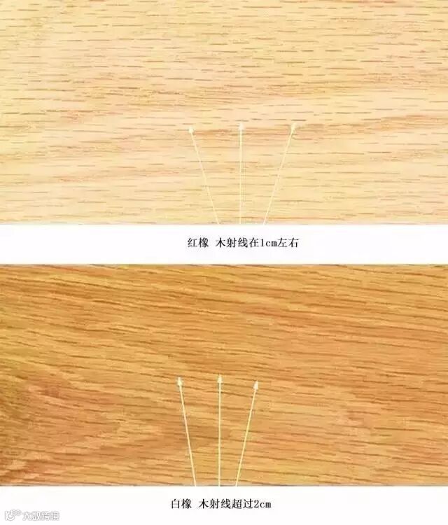 红橡的木射线相对较短,所以白橡比红橡具有更多的木纹,白橡的纹理也比红橡更细腻。