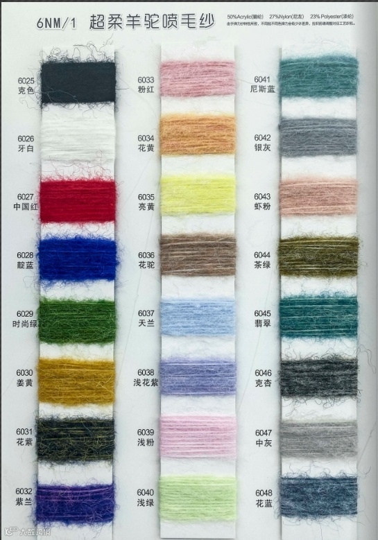 这款产品采用6NM/1的纱支规格,成分比例为44%尼龙、34%晴纶、22%涤纶。具有柔软舒适的特点,适合制作针织衫和家居用品。