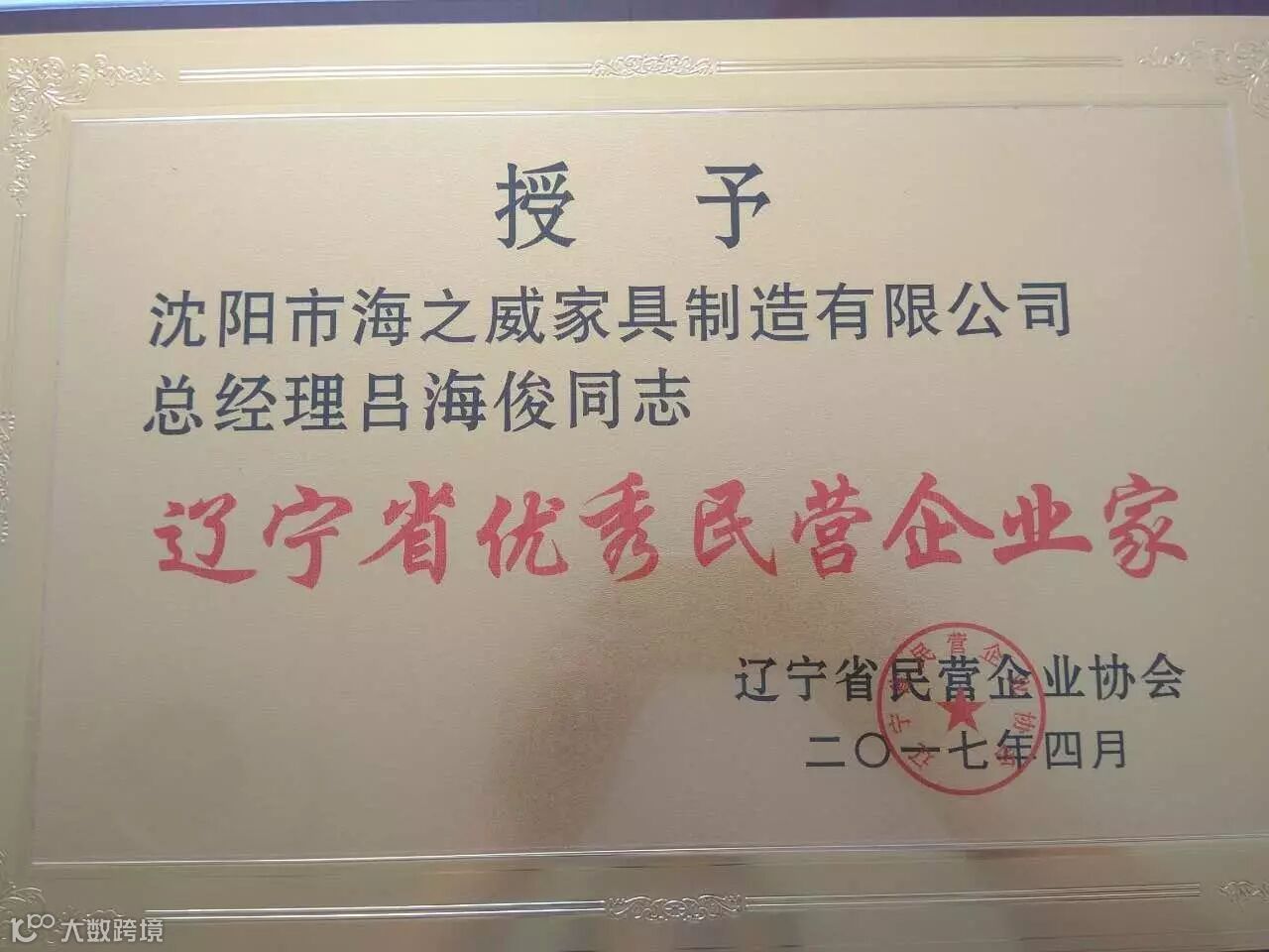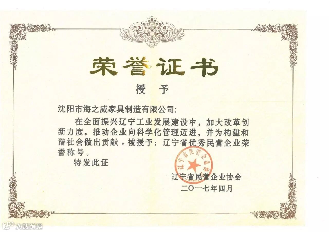 沈阳市海之威家具制造有限公司热烈祝贺我公司获得“辽宁省优秀民营企业”殊荣,