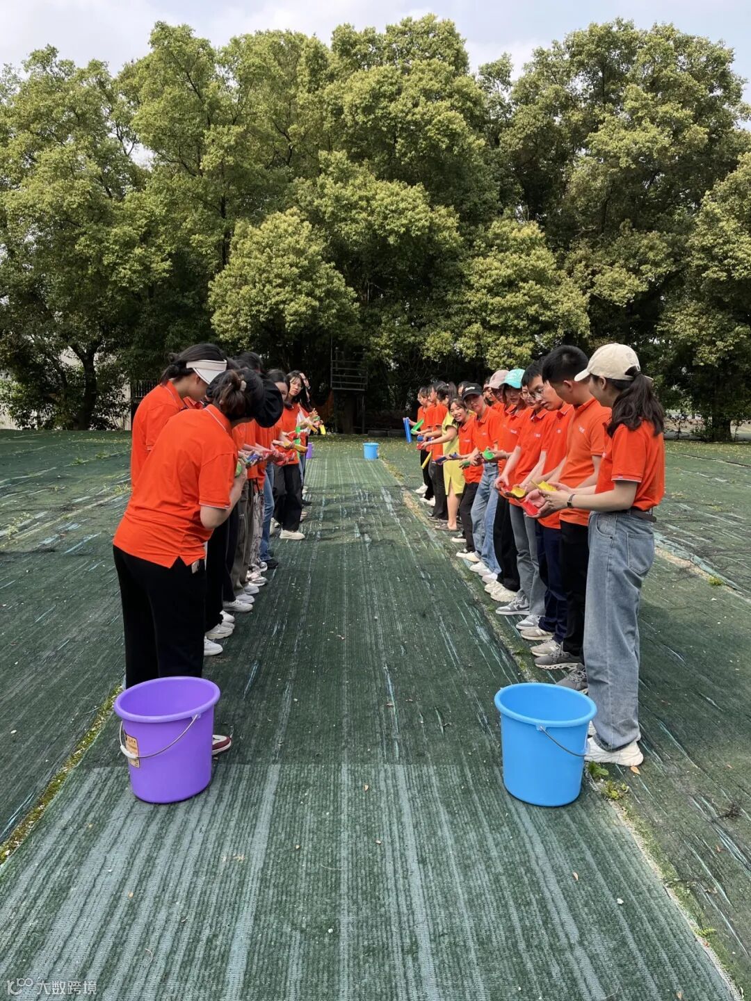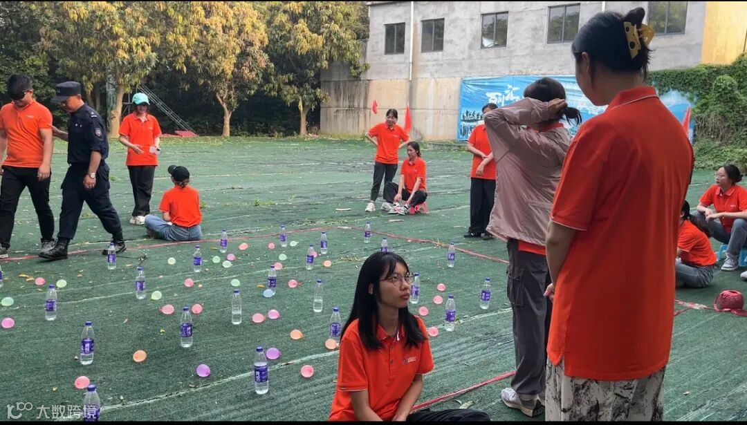 南水北调项目开始先将所有队员分成两个小组,每组队员手持破开为两边的PVC管连接起来形成水槽状,水将在槽管里流动。成员手中的PVC管接力输送水,团队成员不断连接PVC管,循环接力直至将水送至指定的目的地。