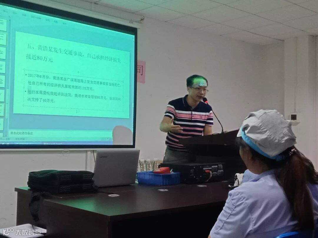 为了积极推进会员企业平安文化建设工作,东莞市福建商会牢牢抓住“人”的核心要素,以会员企业为主阵地,以平安文化建设为重要支撑,深入开展企业平安文化建设,将平安文化建设融入会员企业员工教育培训、企业精神培育、企业形象塑造之中,2018年8月3日下午,东莞市福建商会邀请了广东君爵律师事务所专职律师严智奎赴广东朝阳电子科技股份有限公司开展平安文化建设法律知识讲座。