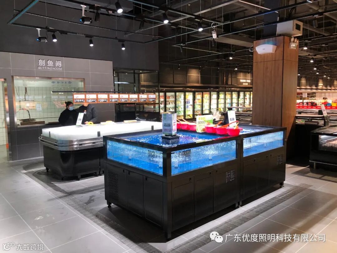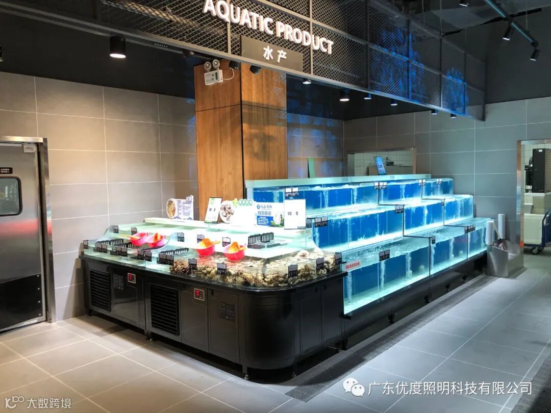 水产区的鲜活水产品在穿透性很强的高色温光线照射下,鱼缸里面的水质更显得晶莹、清澈。而水产品也显得活力十足,提升顾客的购买欲望。