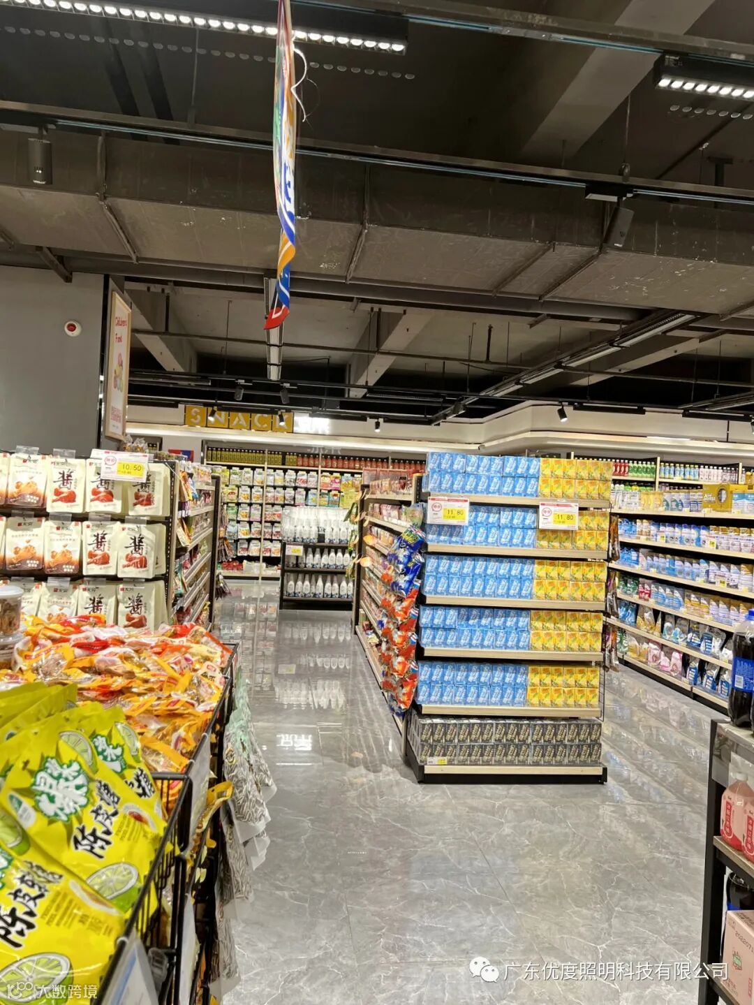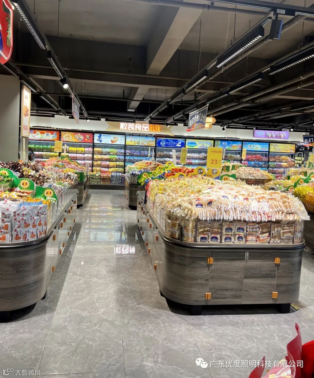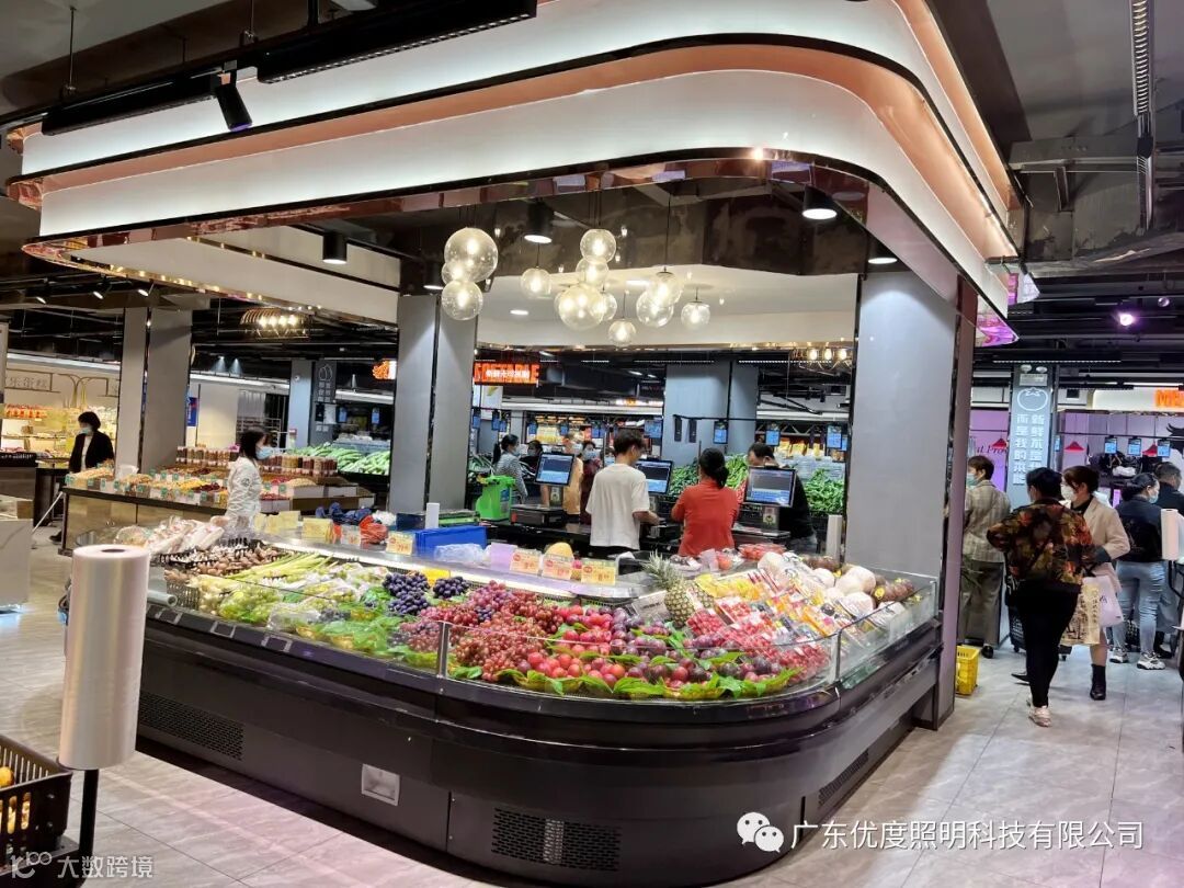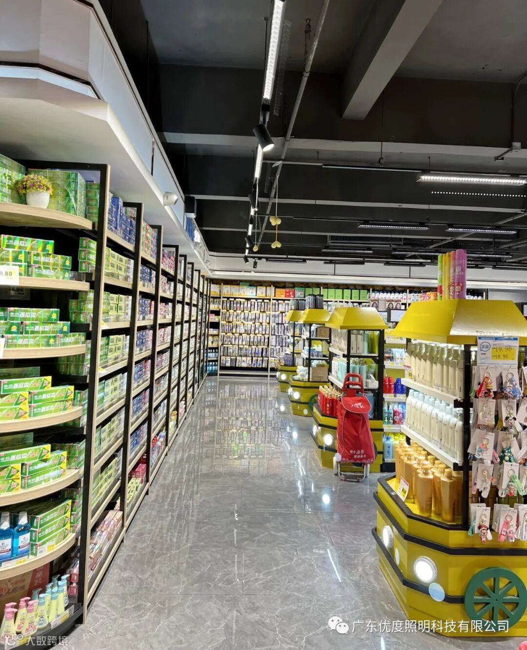 本超市楼层偏低,我们在灯光布局时,特以灵动线性射灯为主,导轨灯,明装筒灯,装饰吊灯等为辅的照明,秉承着“简化”的设计理念进行灯光打造,让天花不再凌乱,还超市天花整齐美观,给顾客营造舒适的空间购物体验。