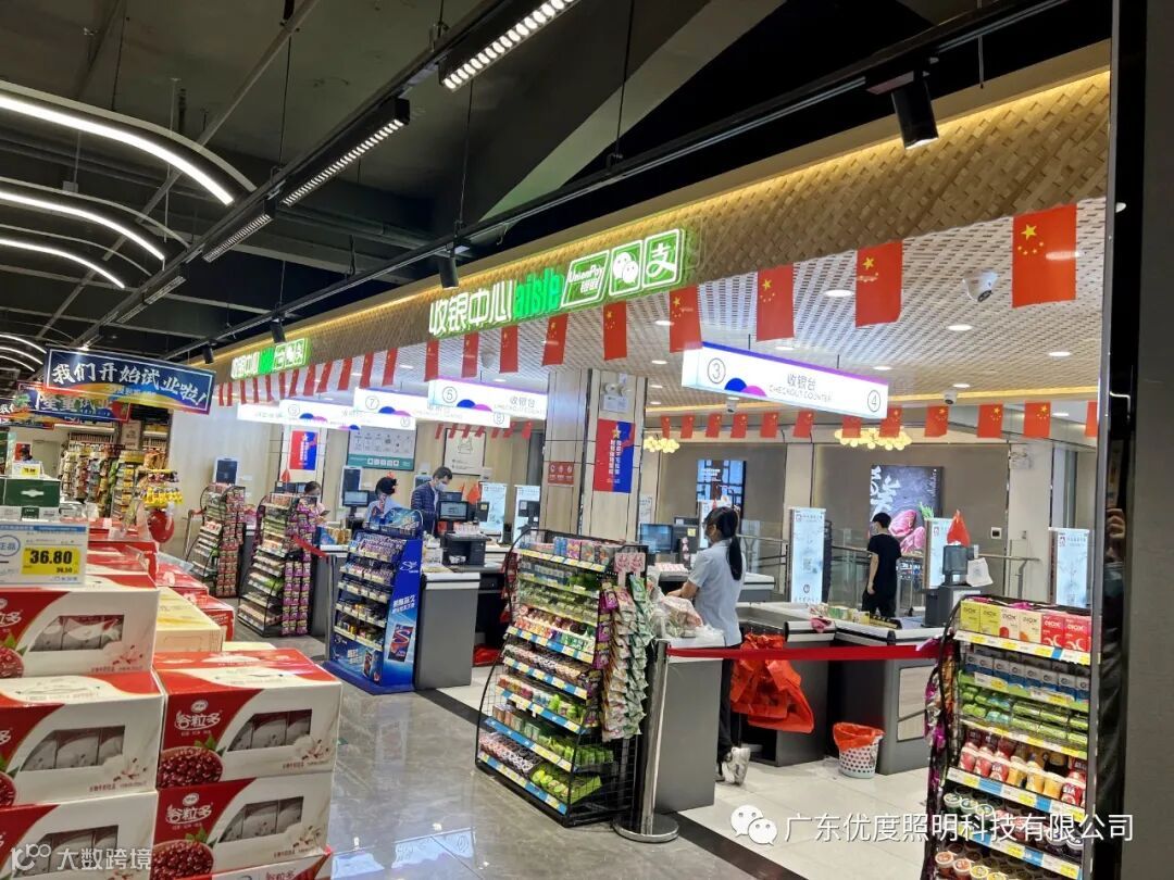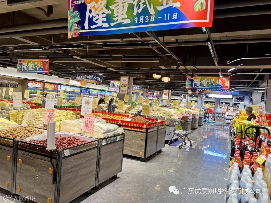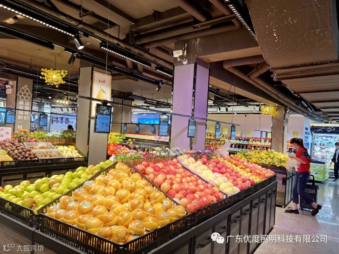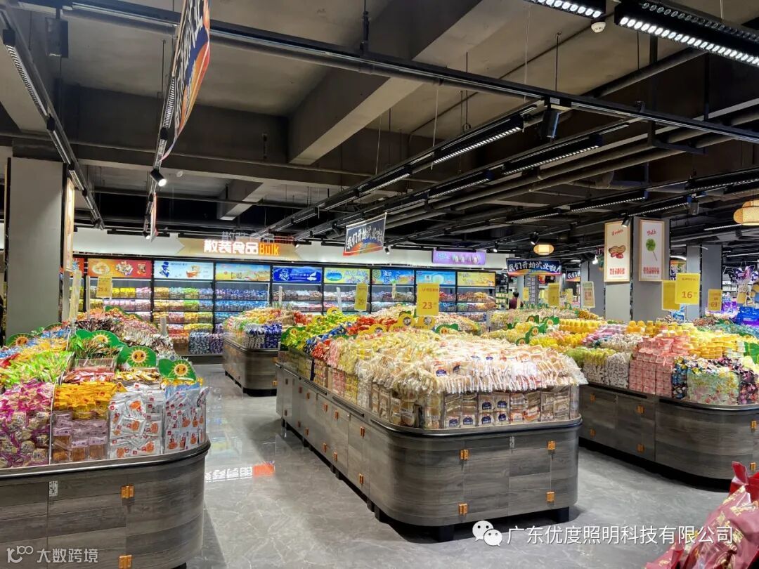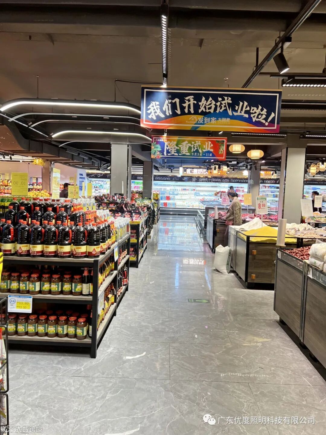 本超市楼层偏低,我们在灯光布局时,特以灵动线性射灯为主,导轨灯,明装筒灯,装饰吊灯等为辅的照明,秉承着“简化”的设计理念进行灯光打造,让天花不再凌乱,还超市天花整齐美观,给顾客营造舒适的空间购物体验。