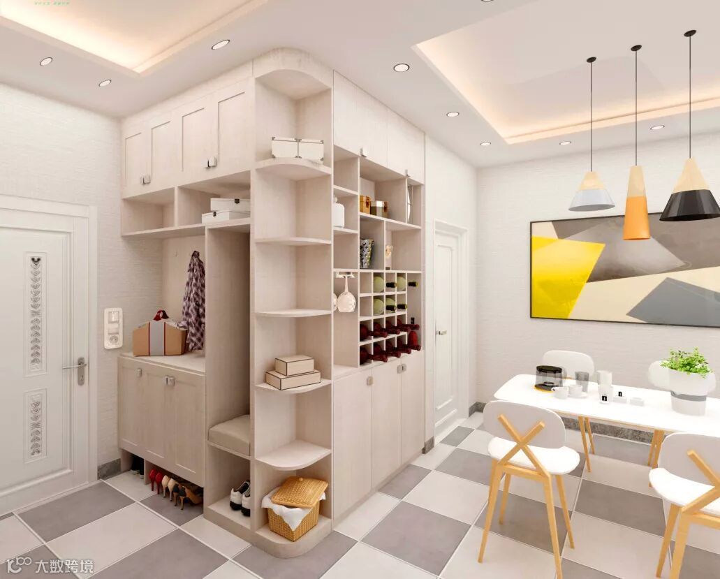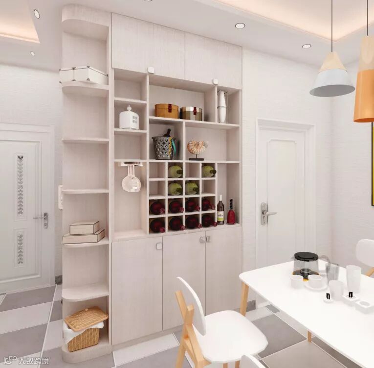 没有突出墙体遮挡,柜体巧妙地连接整合了入户和餐厅空间,进门就能让人眼前一亮。