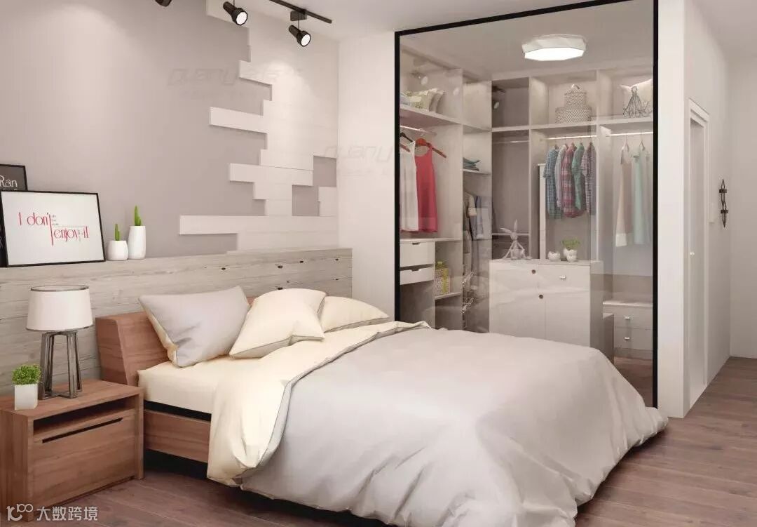 用大面积玻璃隔断,整个空间通透明亮;小小的衣帽间集合了各样式的收纳层,衣物悬挂、叠放以及首饰、行李箱的收放都能满足。