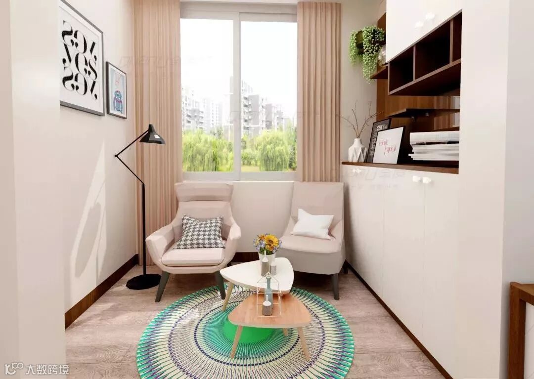 没有阳台,就造一个出来。一个储物柜,两把休闲椅,富有情调的休闲区就诞生了,虽没有大落地窗,但是晒太阳、储物和放松身心的功能一个都不少。