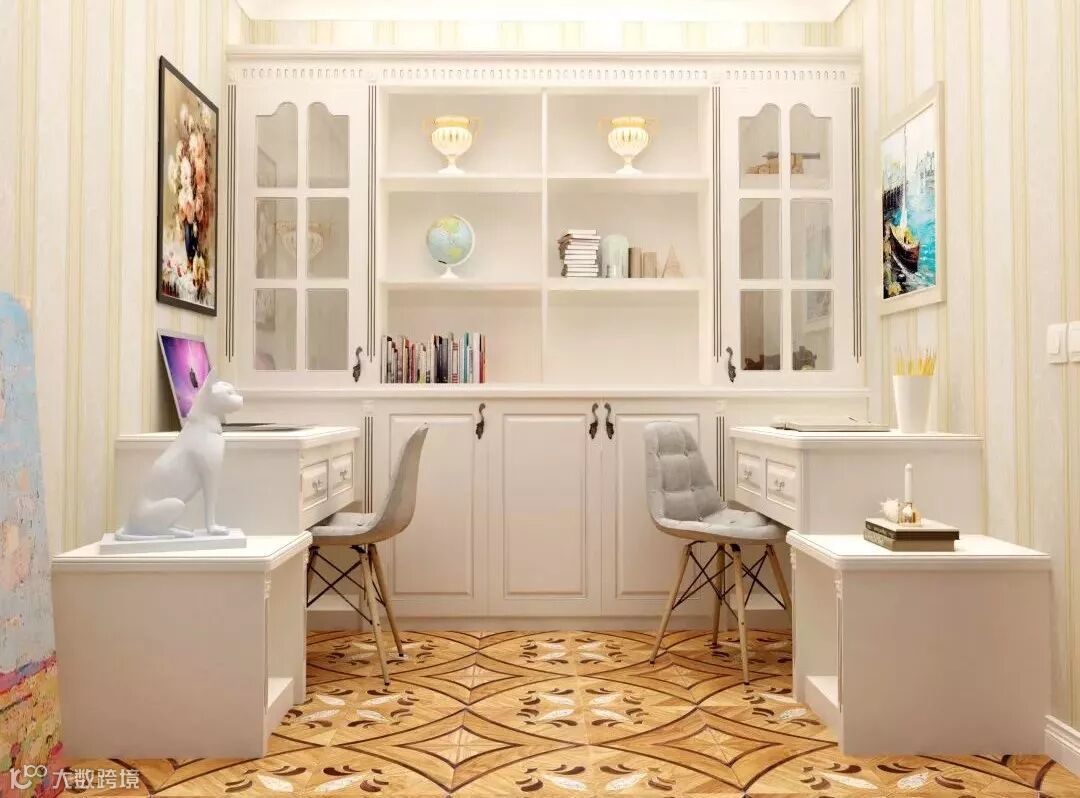 满足两人需求定制的书房,分别靠墙摆放书桌,背对背的专心致志,互不打扰。占据整面墙的书柜,对称设计更能完美收纳两个人的喜好。