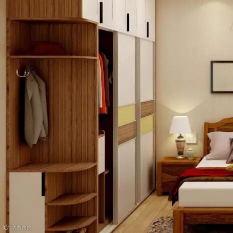 床另一侧的移门衣柜可放当季衣物,转角的开放架,收藏了日常随手摆放的小件物品。