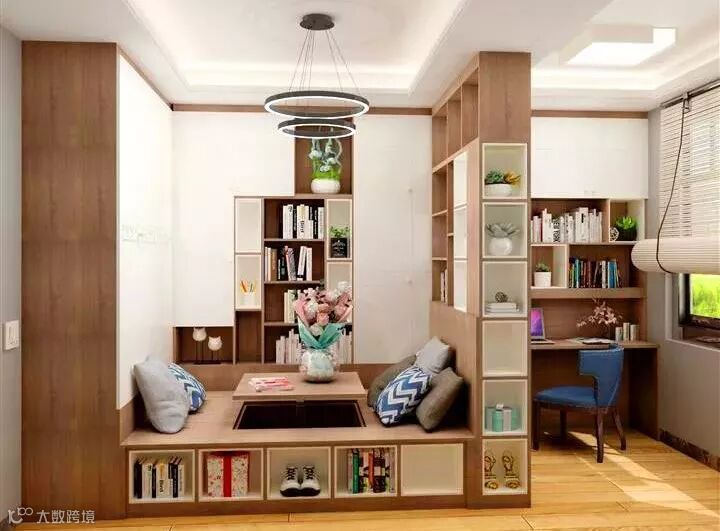 书房里三面环绕的书柜营造了相对安静的环境,升降式的榻榻米满足了会客、阅读各种需求。房内的隔断,由格状书架组成,使得右侧的书桌独立开来。尽管在一个空间也可以不被打扰,尽情地和奇思妙想激烈碰撞。