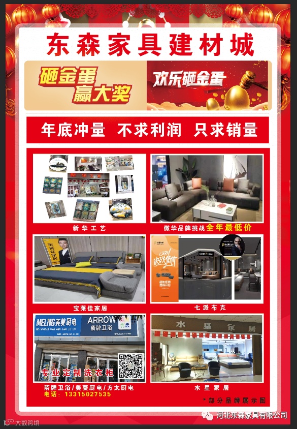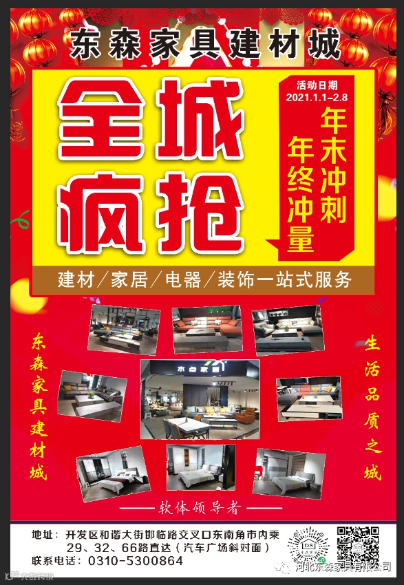 转眼年终,东森家具建材城携手所有商户在这里提前祝您元旦快乐,为了回馈新老顾客,给客户带来超值体验,东森家具建材城年底冲量,不求利润,只求销量,挑战全年最低价,家装盛宴一站式服务,做到省钱、省力、更省心。