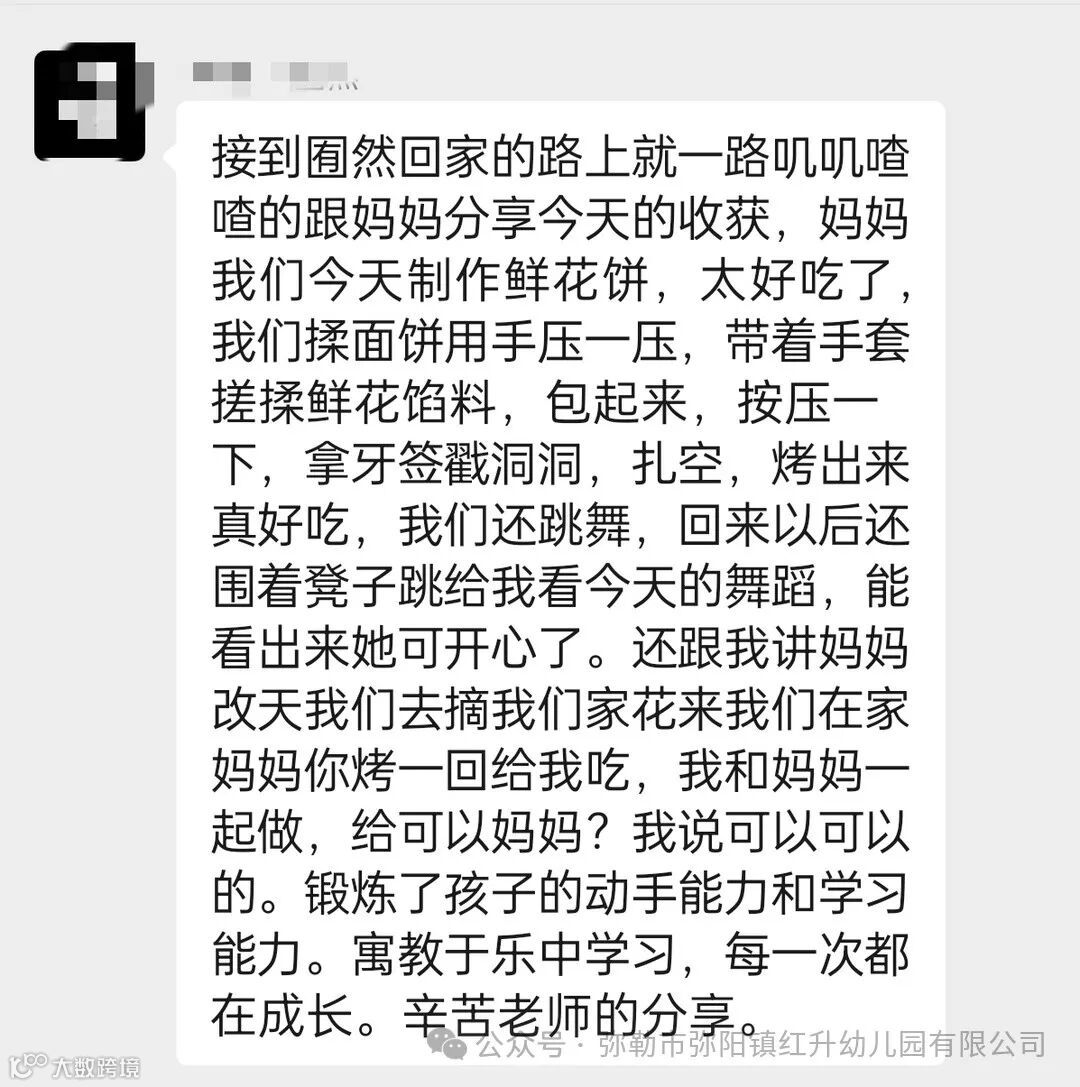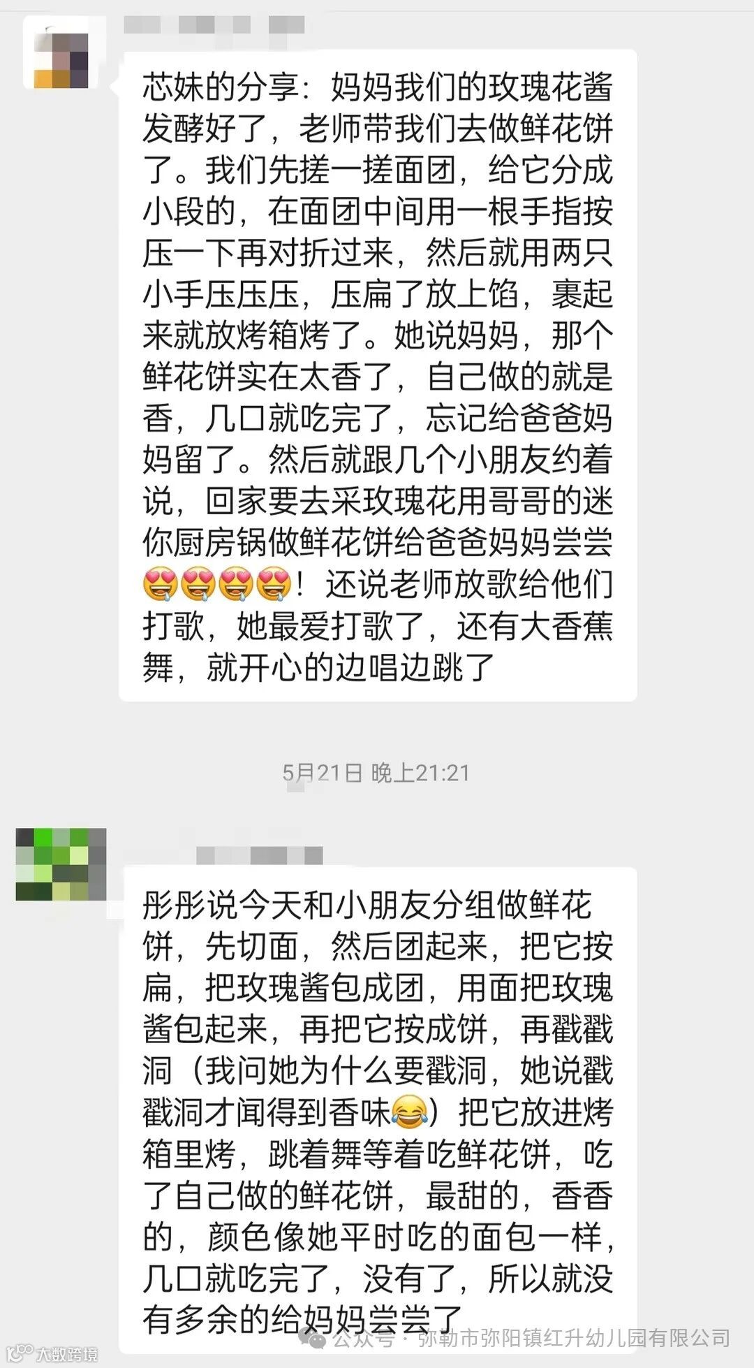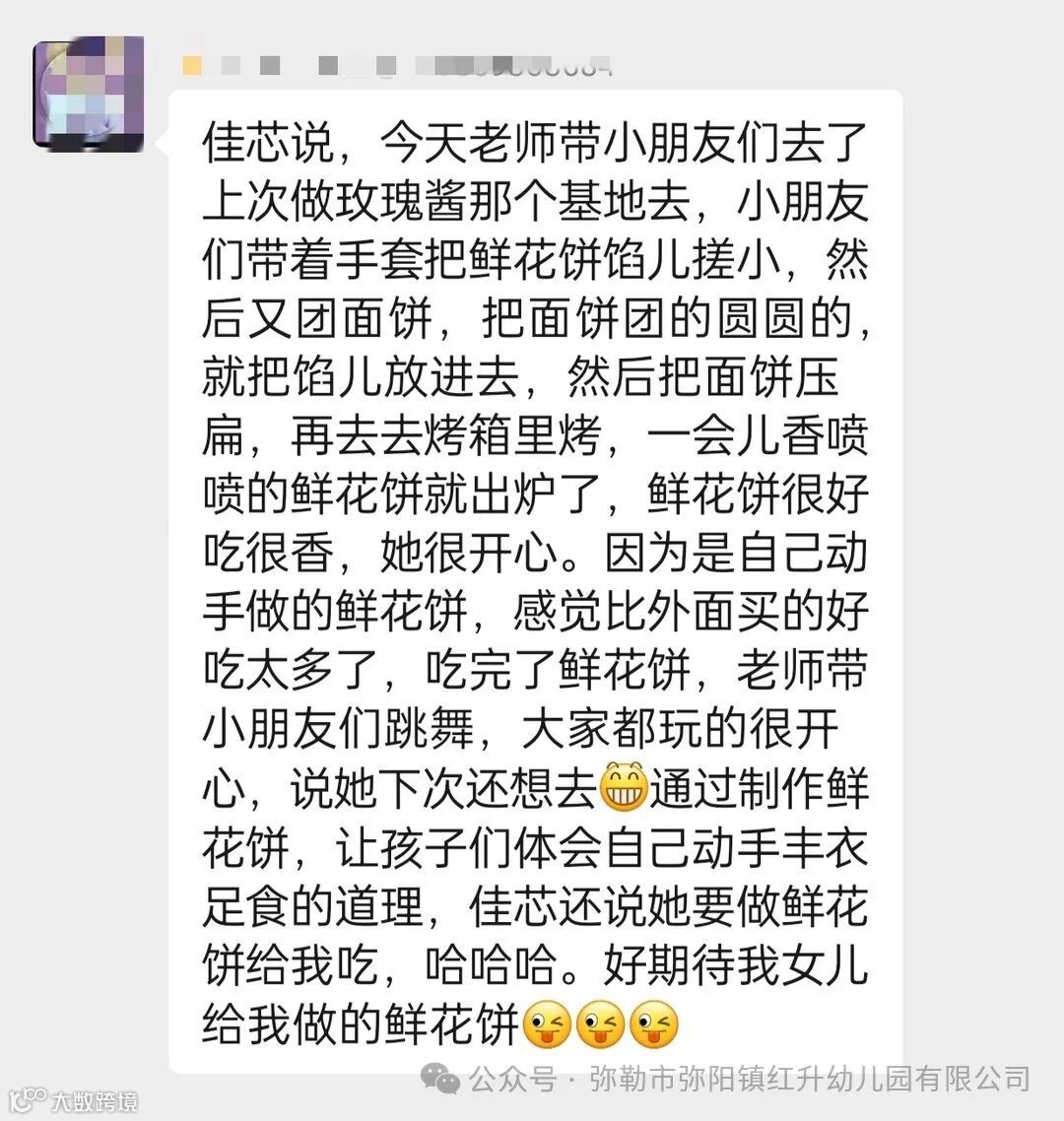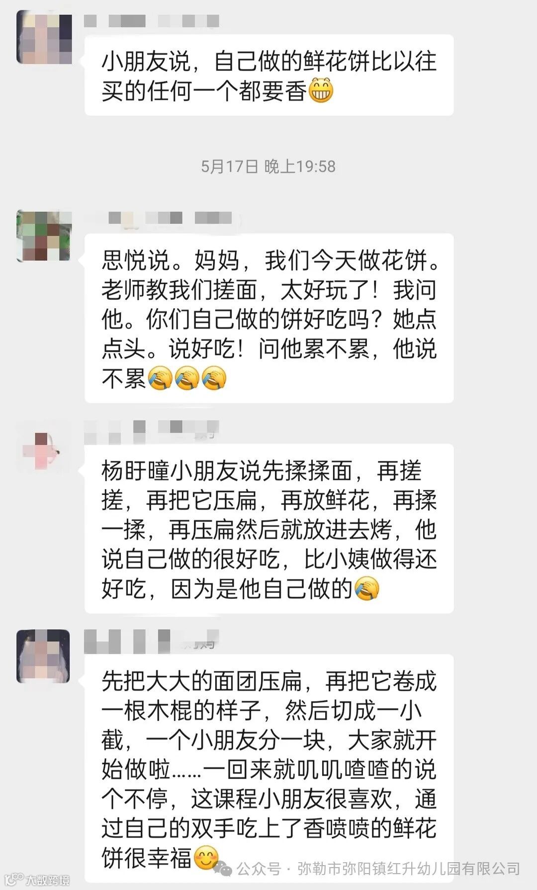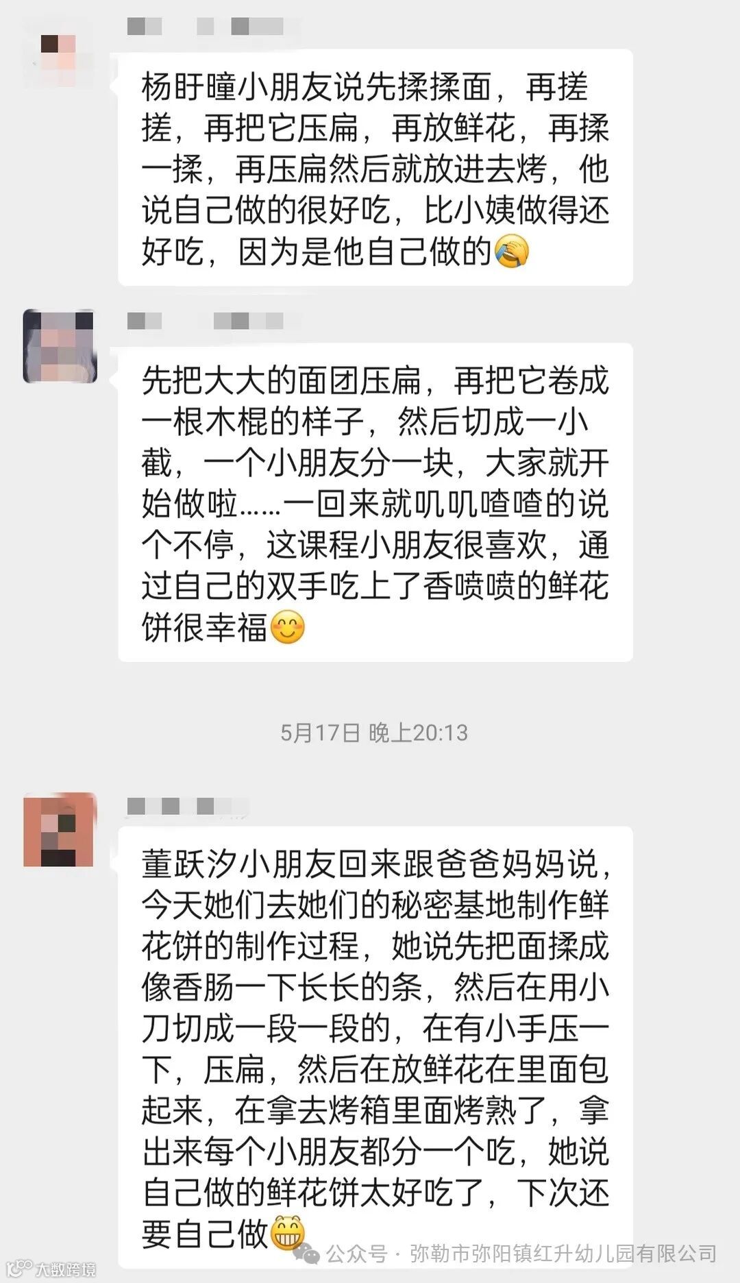 活动后,家长们纷纷在班级群里分享了孩子们参与制作鲜花饼的快乐和喜悦,一字字、一句句将我们带回制作现场,画面感极强的同时,背后是孩子们的体验、成长、认知、感受的集锦。